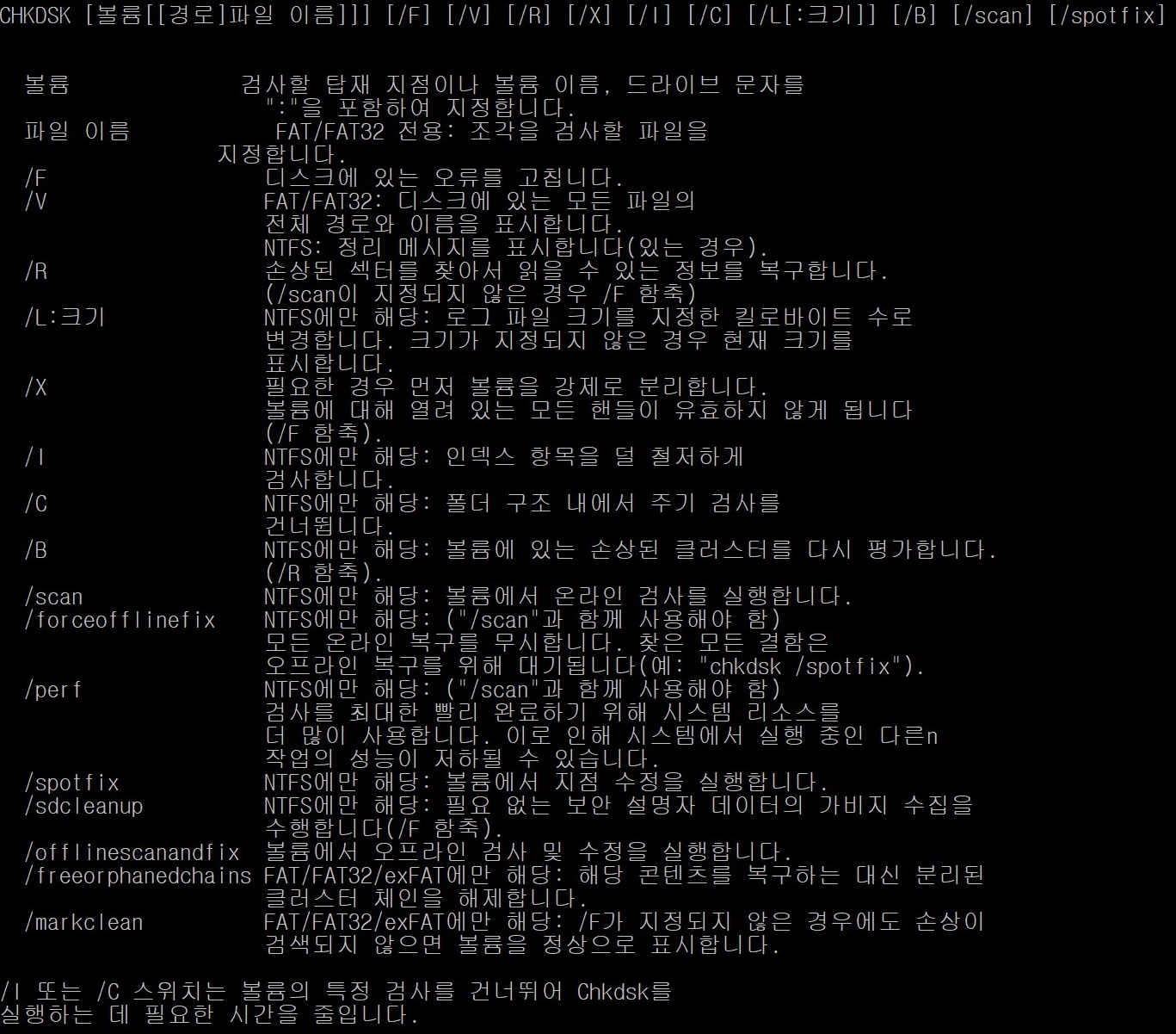 checkdisk 라는 의미의 명령어구요. /r 은 오류가 발견되면 repair 즉 수정하라는 의미의 옵션입니다.