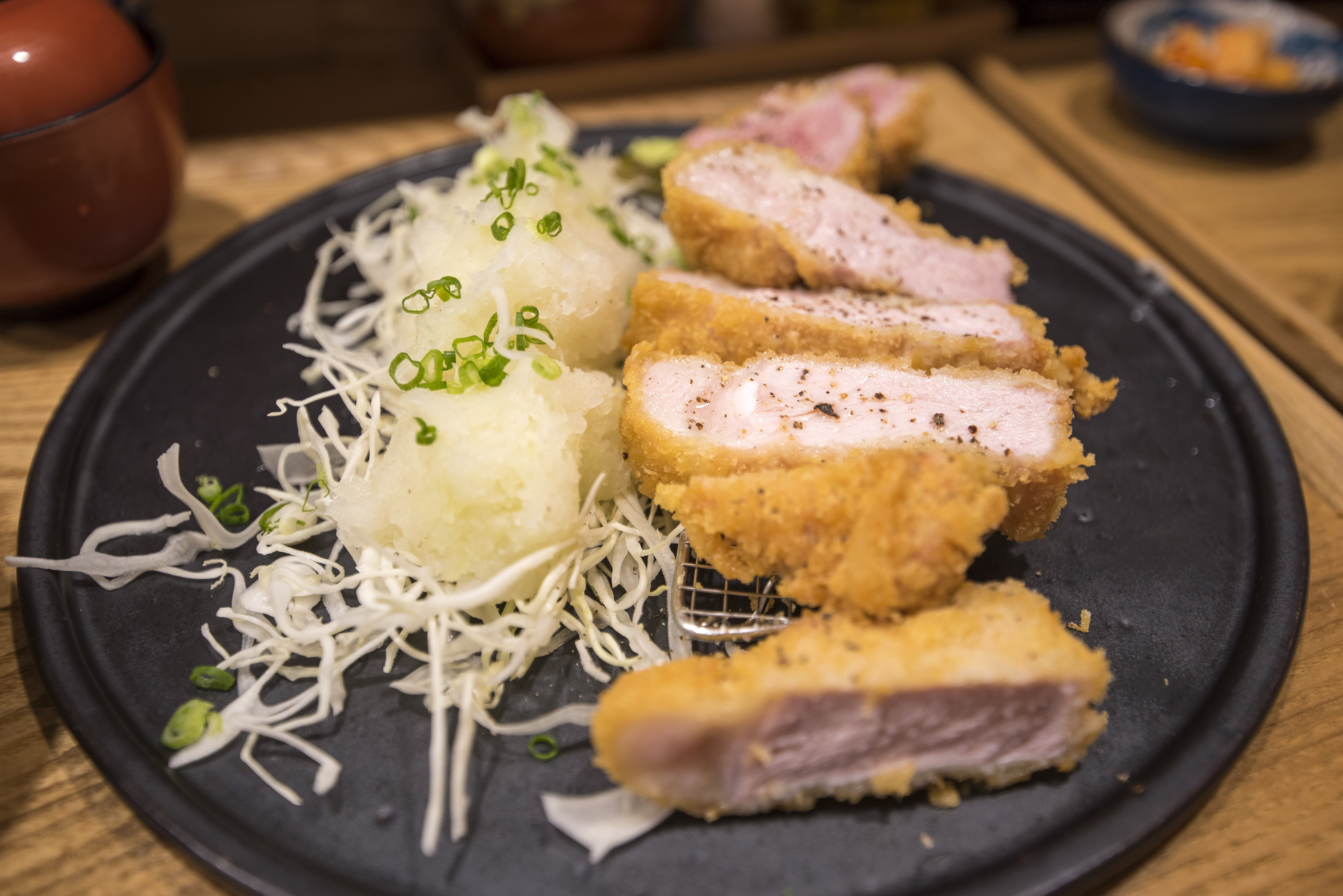 오로시카츠 모듬정식이 나왔습니다. 서빙하기 전에 후추가루를 뿌릴 건지 물어보고 직접 통후추를 갈아서 뿌려줍니다.