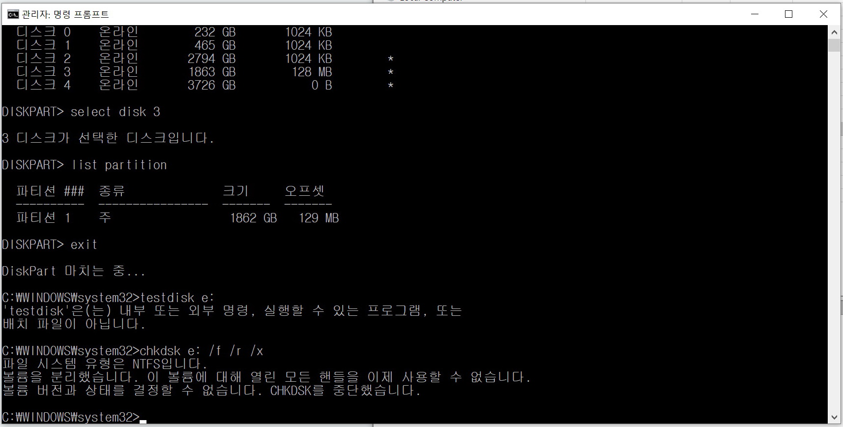 체크디스크 명령어는 chkdsk :드라이브명 /f /r /x 이렇게 쓰구, /r을 쓰면 /f는 굳이 안 써도 되는데 그냥 한번 써봤다.
