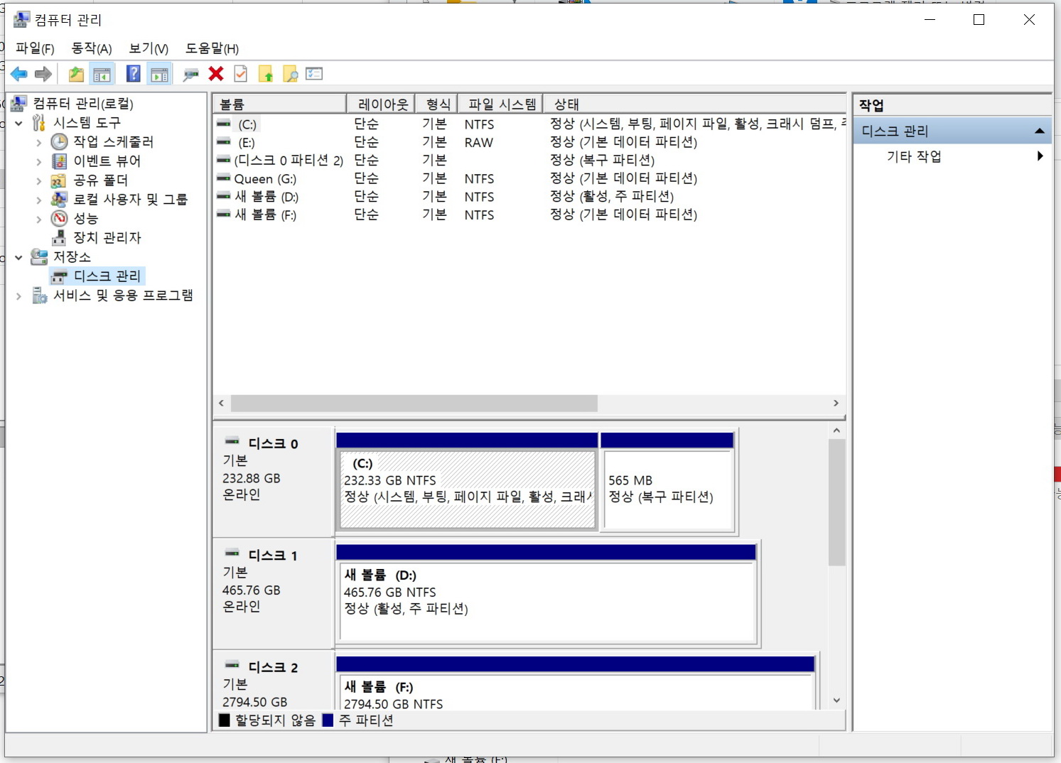 보다시피 위와 같이 윈도 디스크 관리에 RAW디스크로 뜬다.
