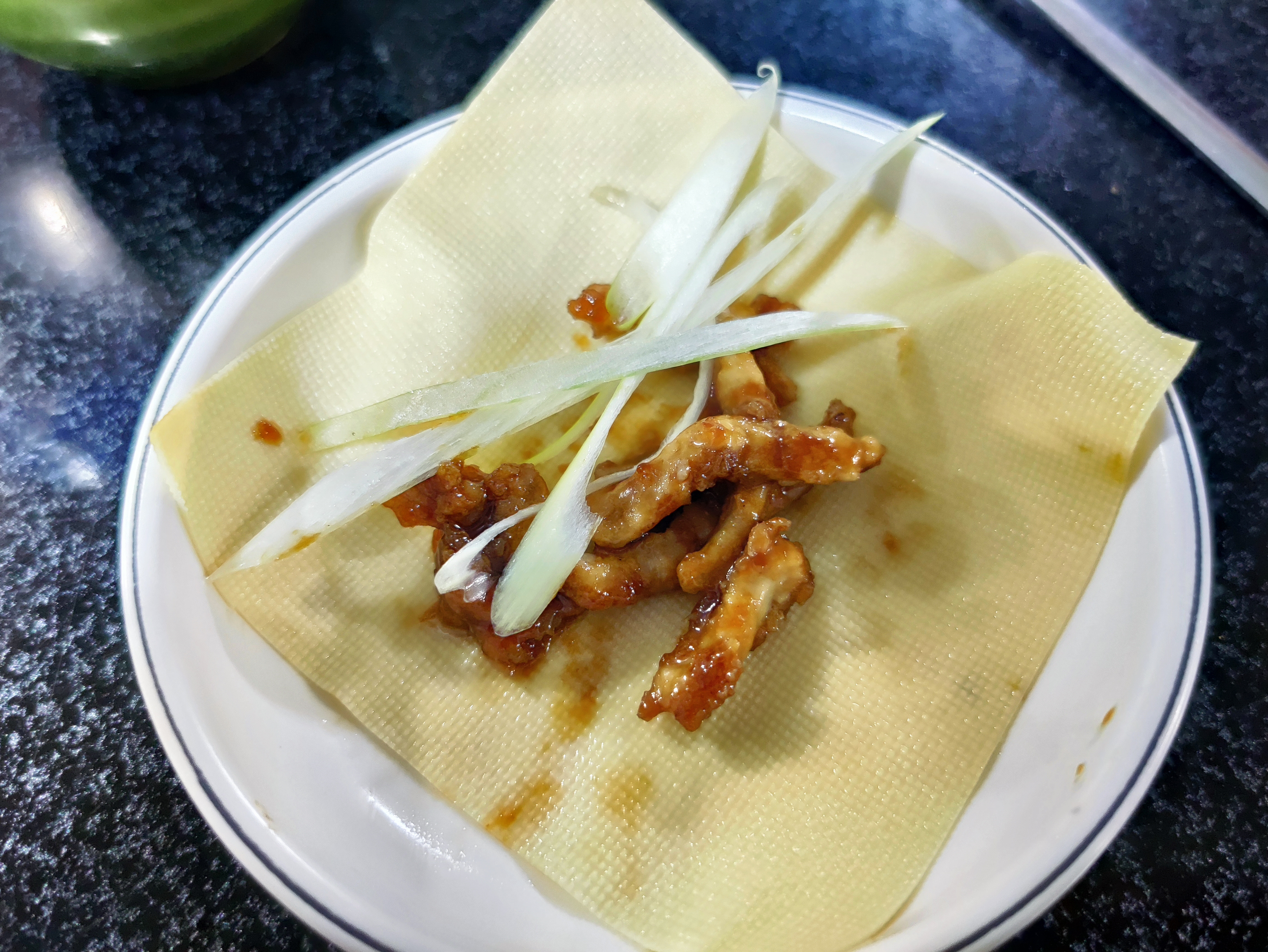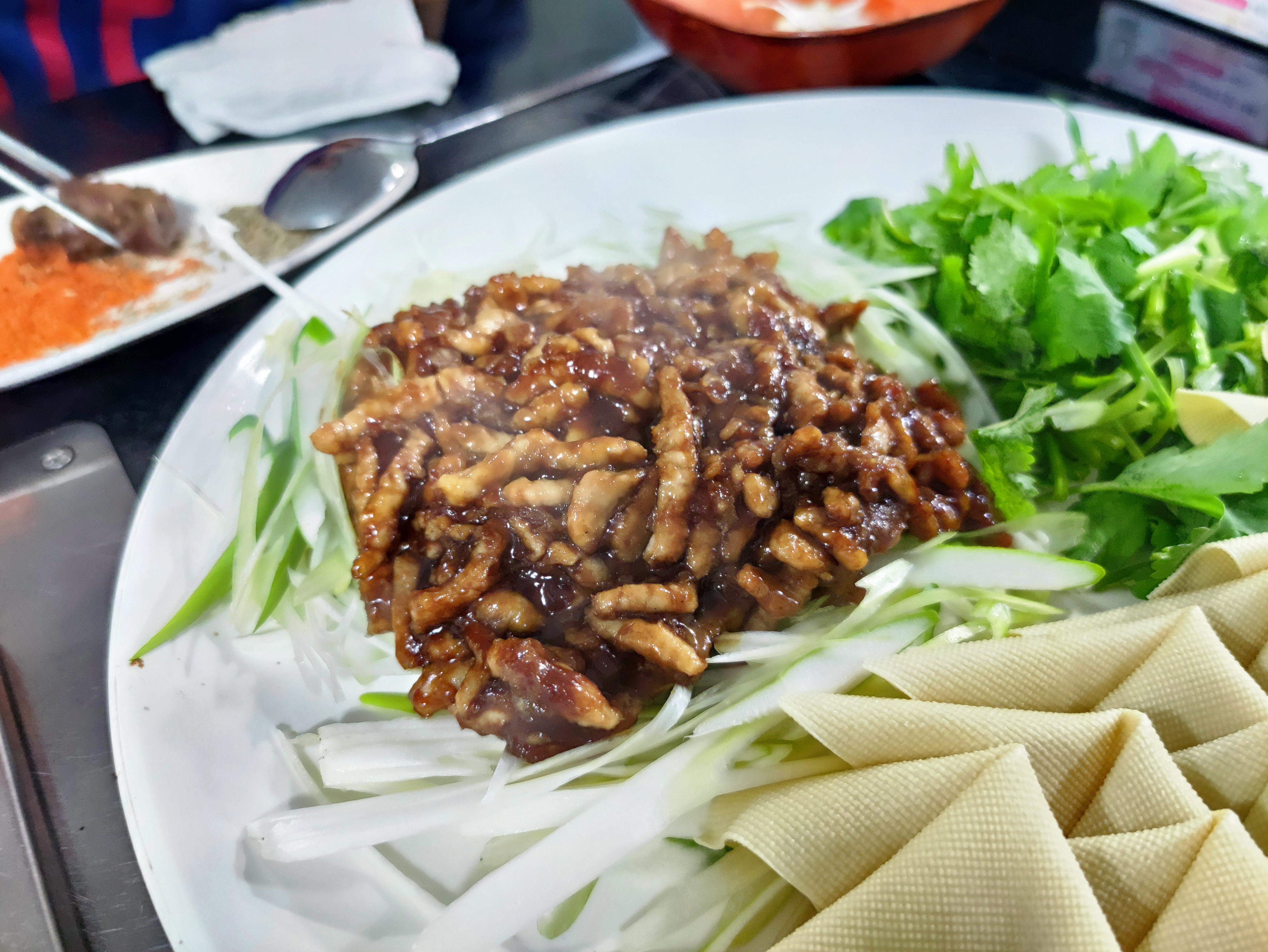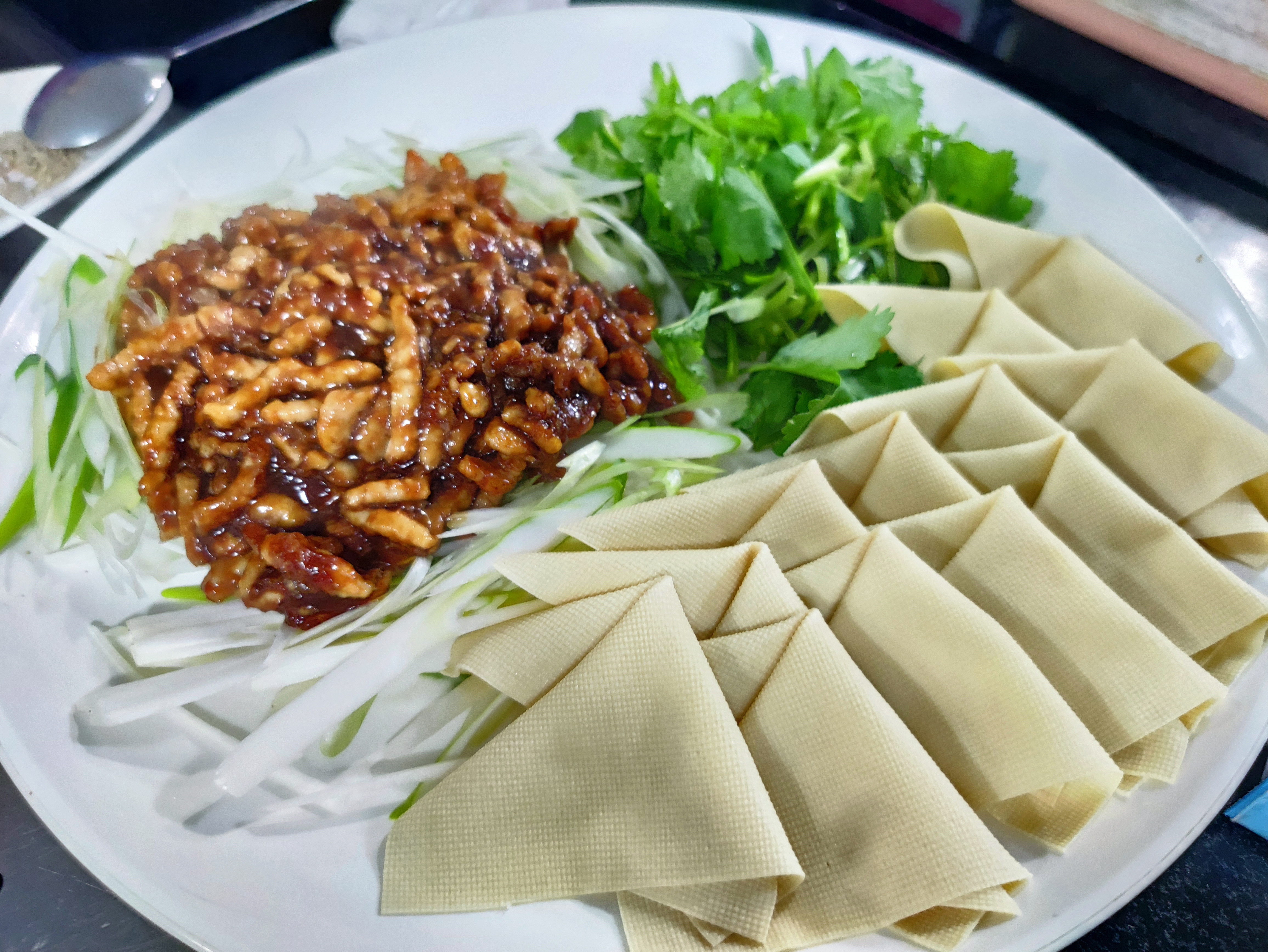 볶은 돼지고기에 파채, 고수 등을 넣고 두부피로 싸먹는 음식이다.