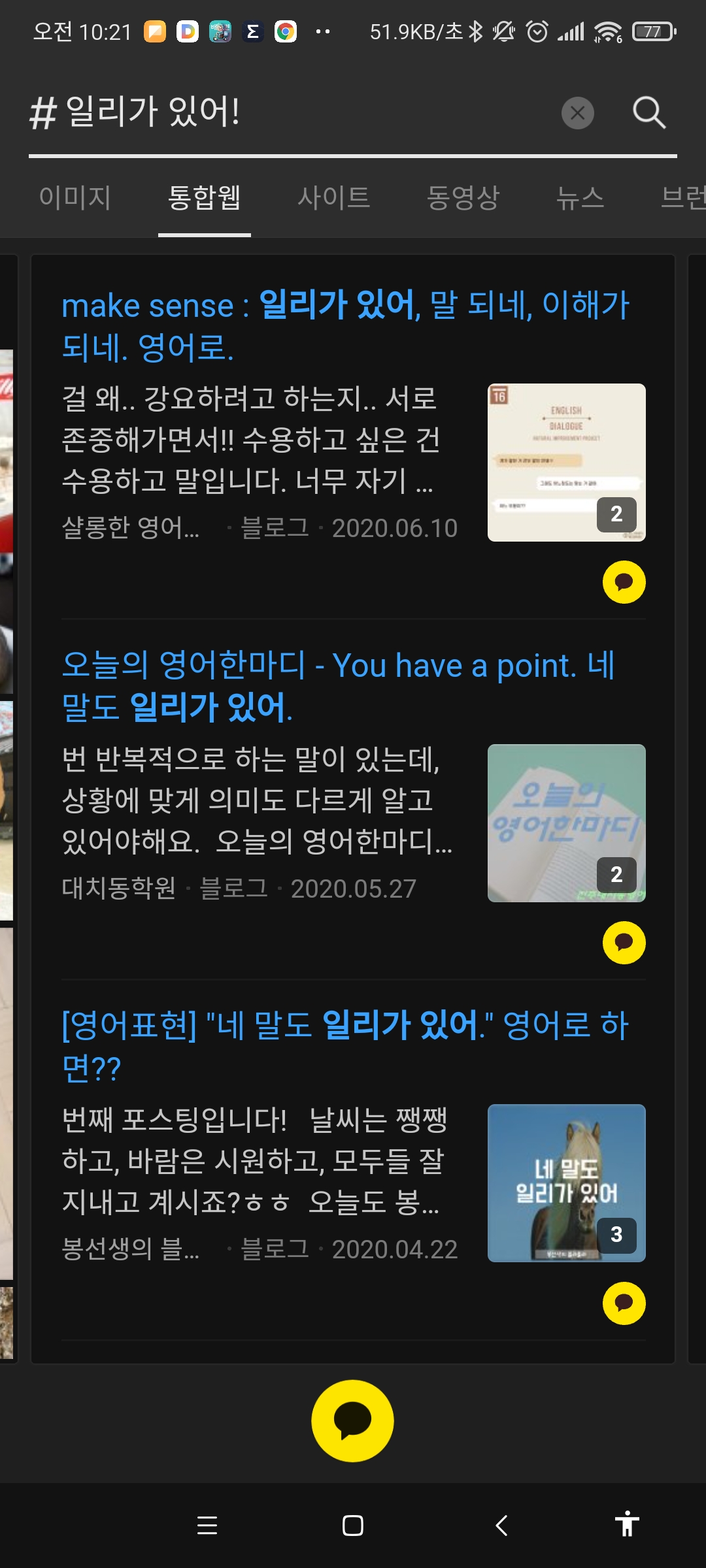 그리고 통합 검색결과도 '일리가 있어!' 라는 검색어와 거의 100% 매칭되는 검색 결과를 보여주었다.