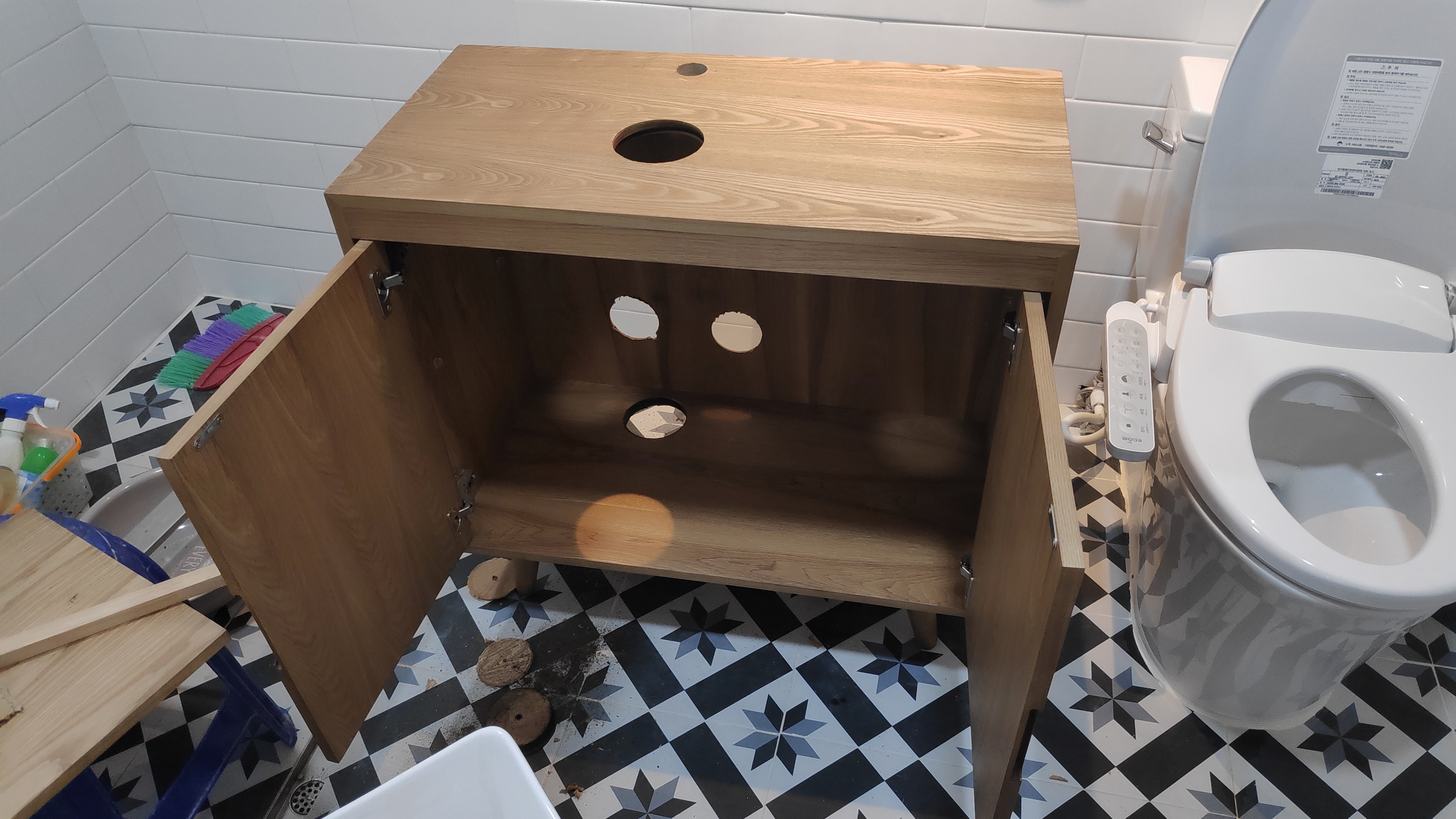 일단 세면대 위치를 잡은 다음에 위치에 맞춰 구멍을 냈다.