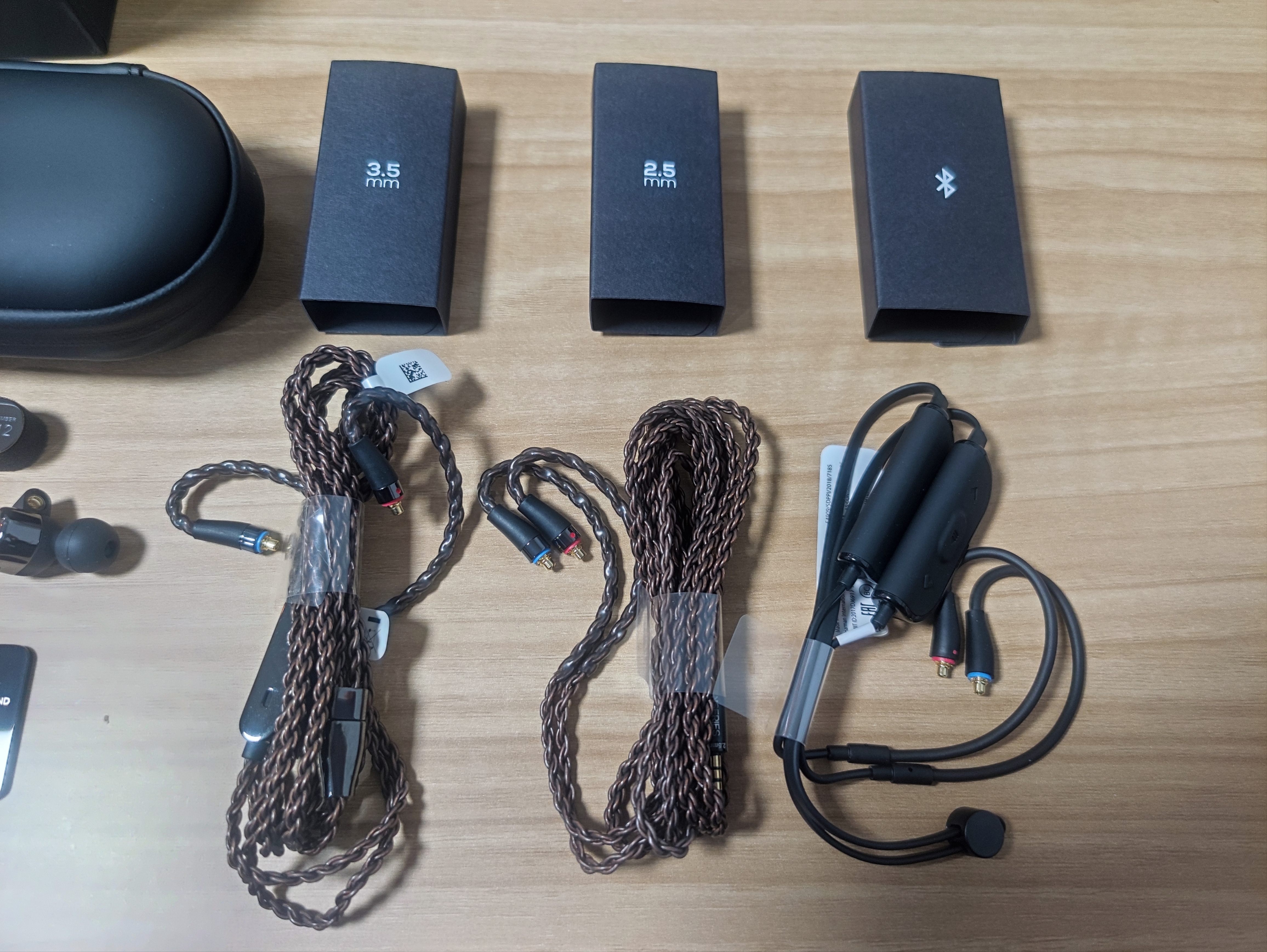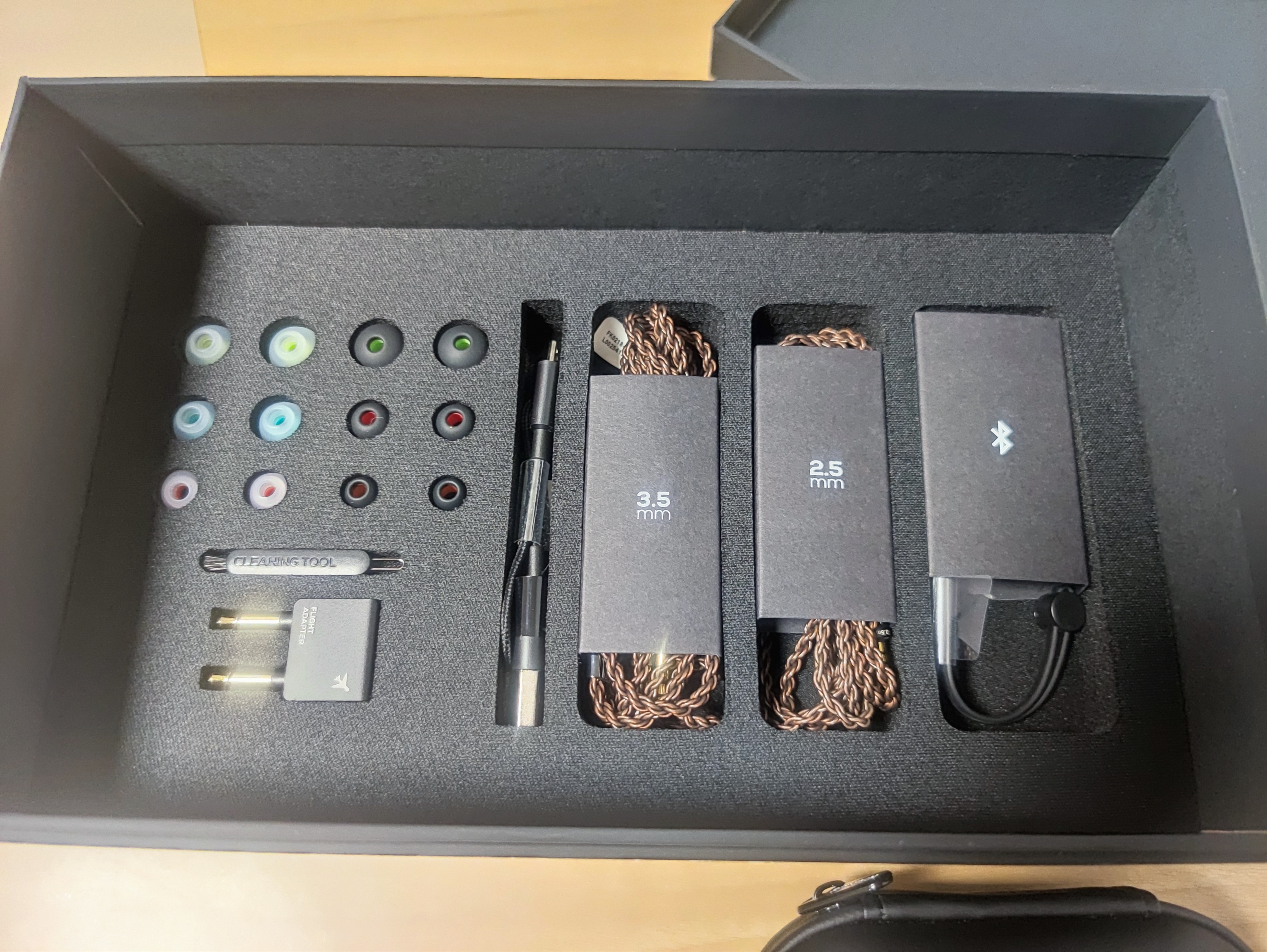다양한 팁들과 클리너, 비행기용 어댑터, 마이크로5핀 충전케이블, 3.5mm 케이블(마이크 포함), 2.5mm 밸런스드 케이블, 블루투스 모듈까지 구성품이 다양하다.