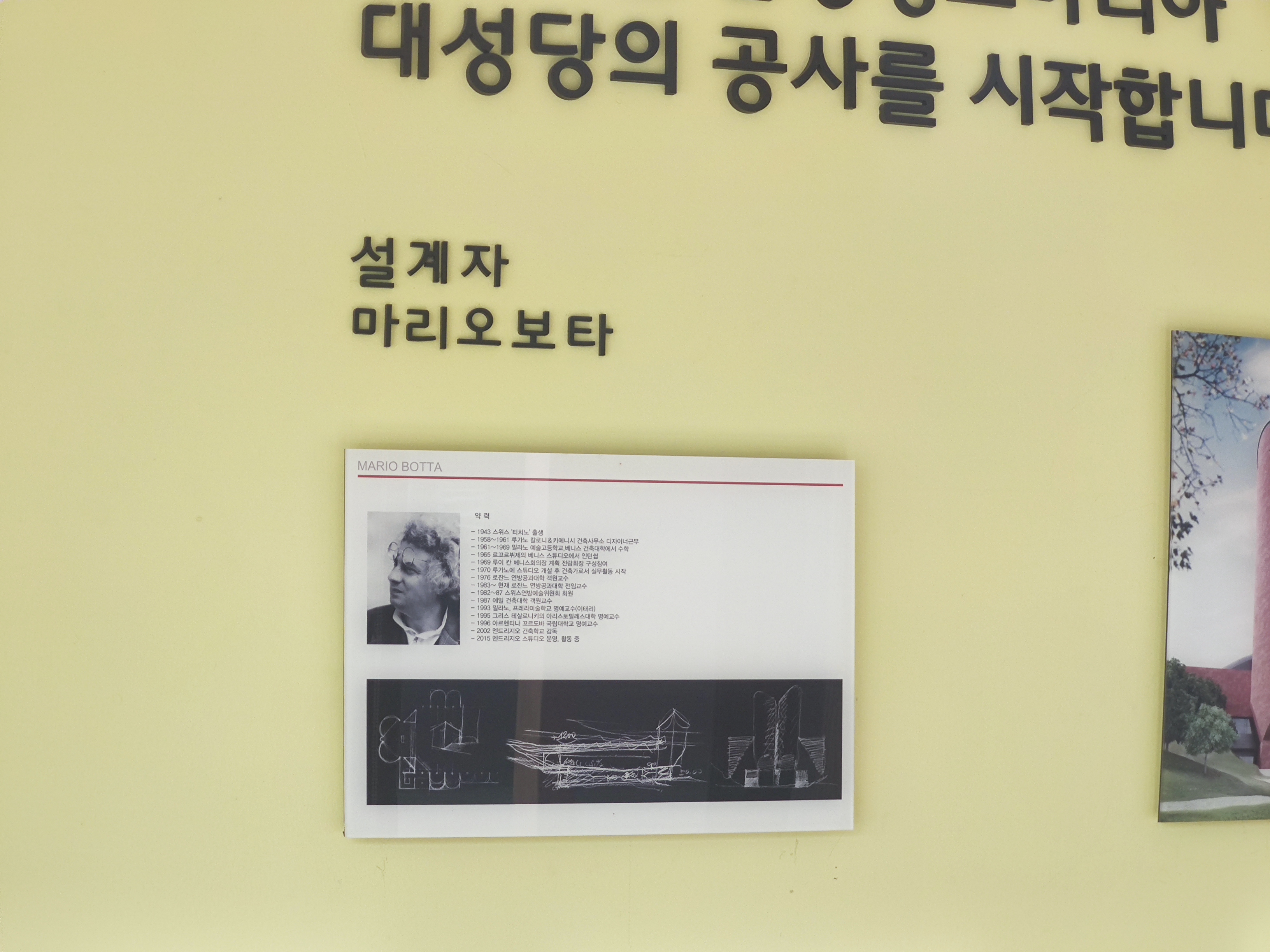 마리오 보타는 1943년 스위스 출생으로 국내에는 서울 강남 교보문고 빌딩, 삼성 리움 미술관, 제주 휘닉스 아고라 클럽하우스 등을 설계하였다.