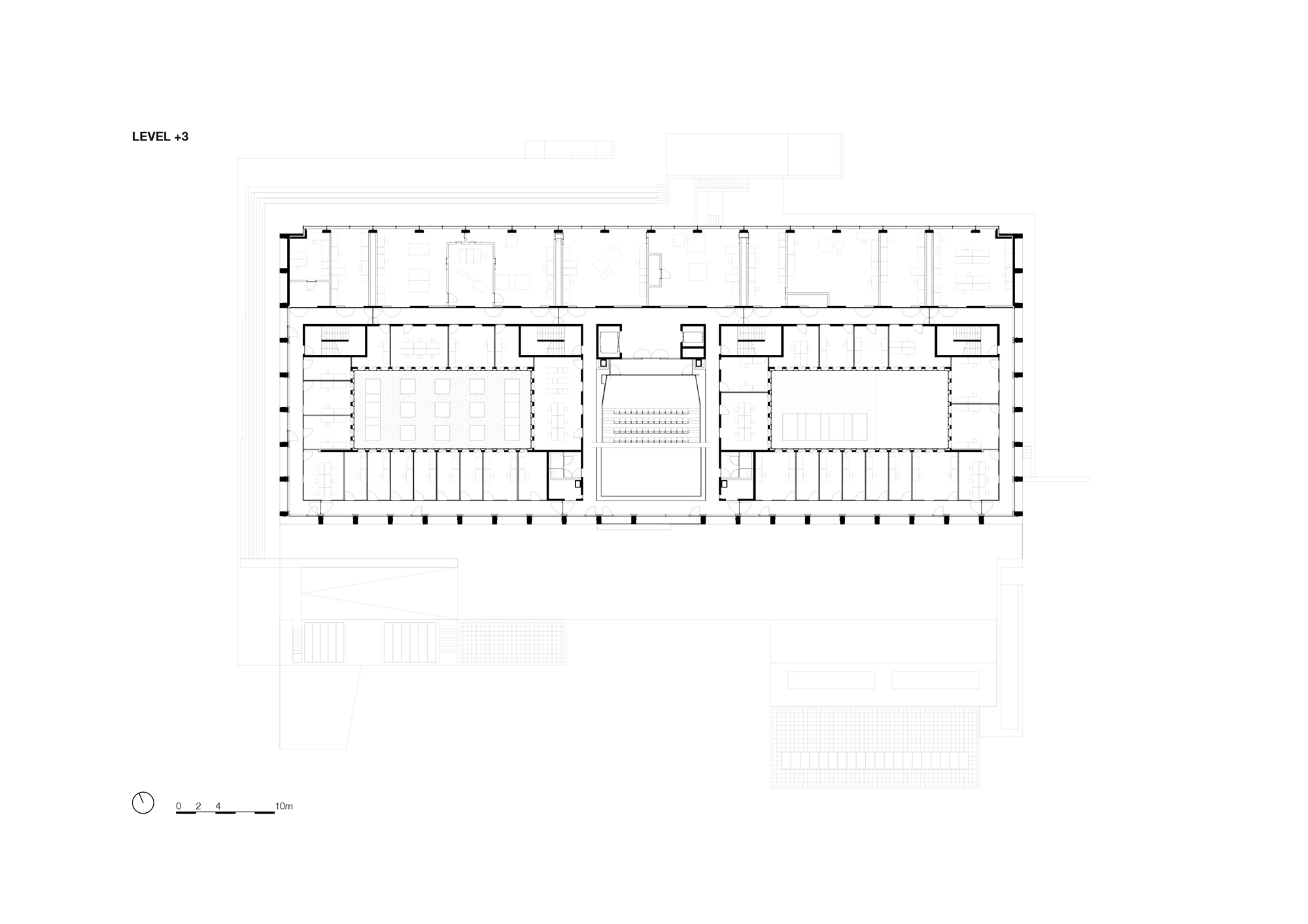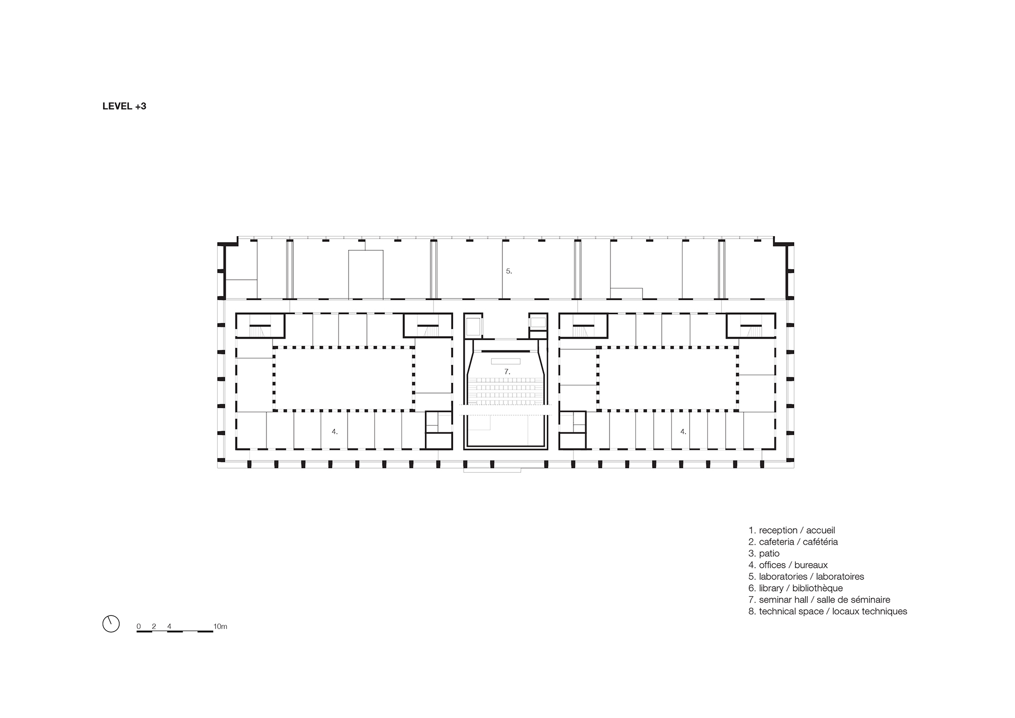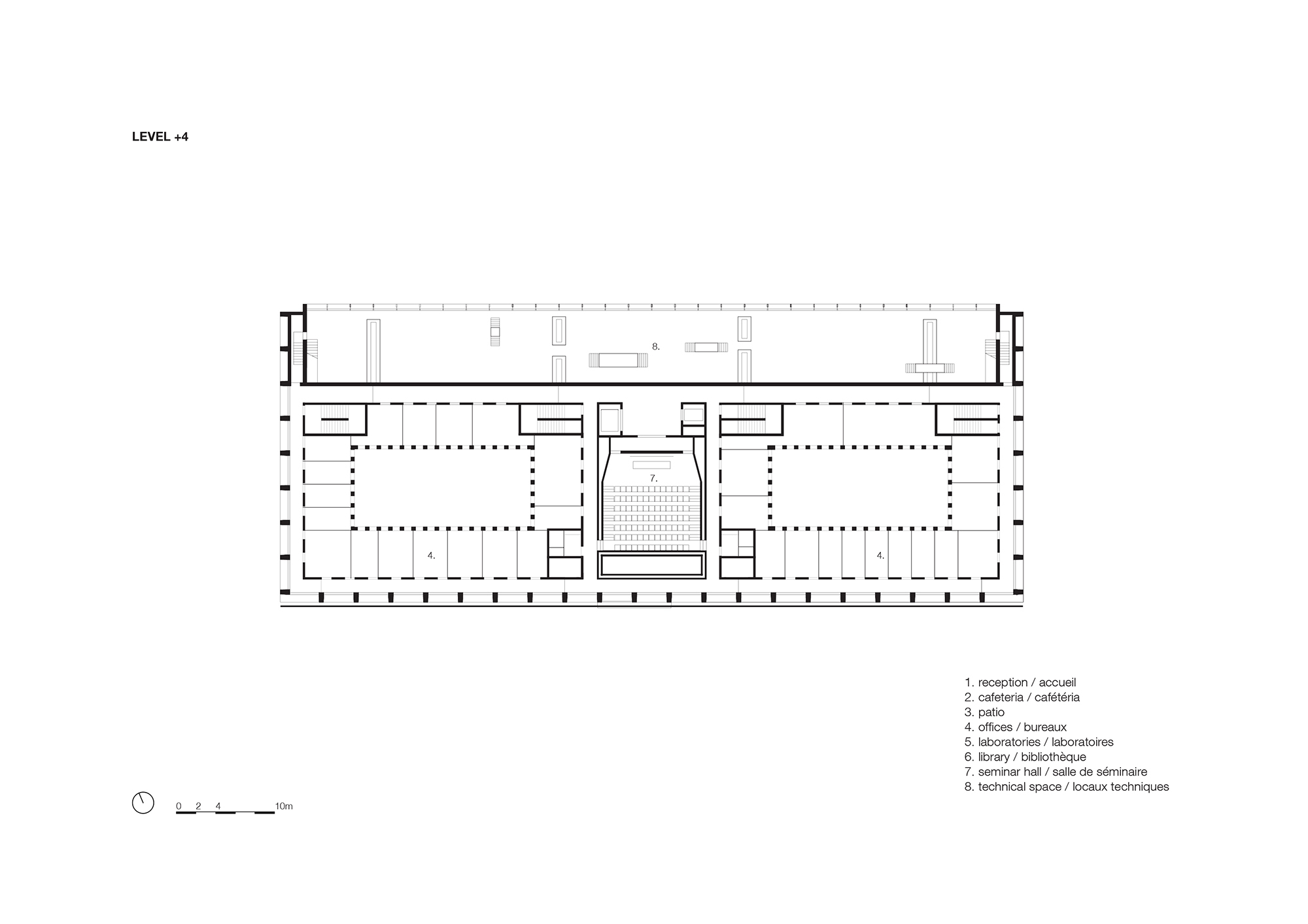 Alongside laboratory research and data processing, the building accommodates academic education through an auditorium that is suspended like a box over the atrium at levels 3 and 4. The sloping underside of the seating area is a perfect complement to the skylight, as it reflects and doubles the light. Inside, the auditorium is warmly cladded with oak.
