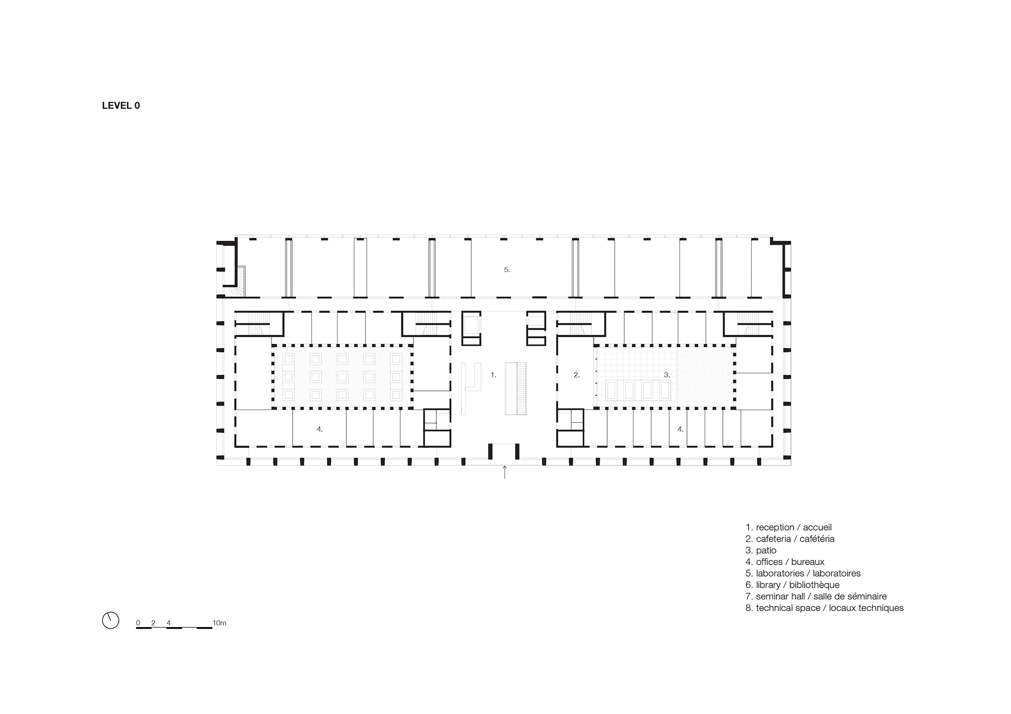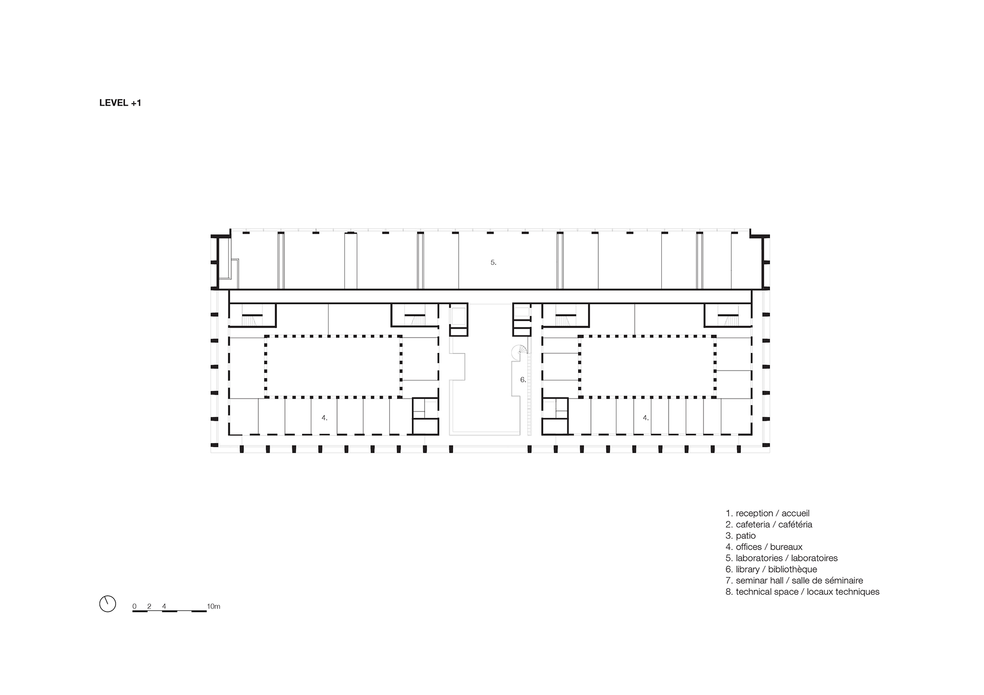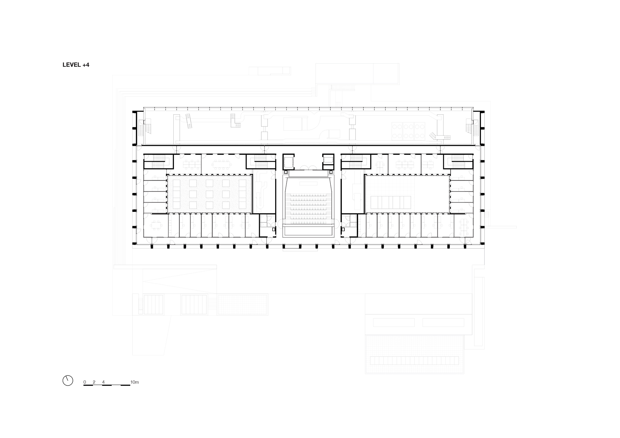 Alongside laboratory research and data processing, the building accommodates academic education through an auditorium that is suspended like a box over the atrium at levels 3 and 4. The sloping underside of the seating area is a perfect complement to the skylight, as it reflects and doubles the light. Inside, the auditorium is warmly cladded with oak.