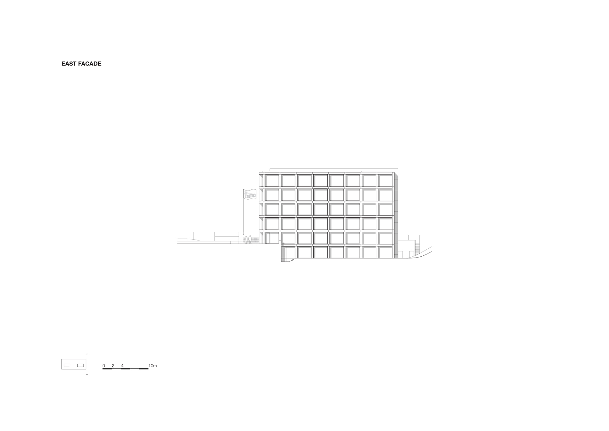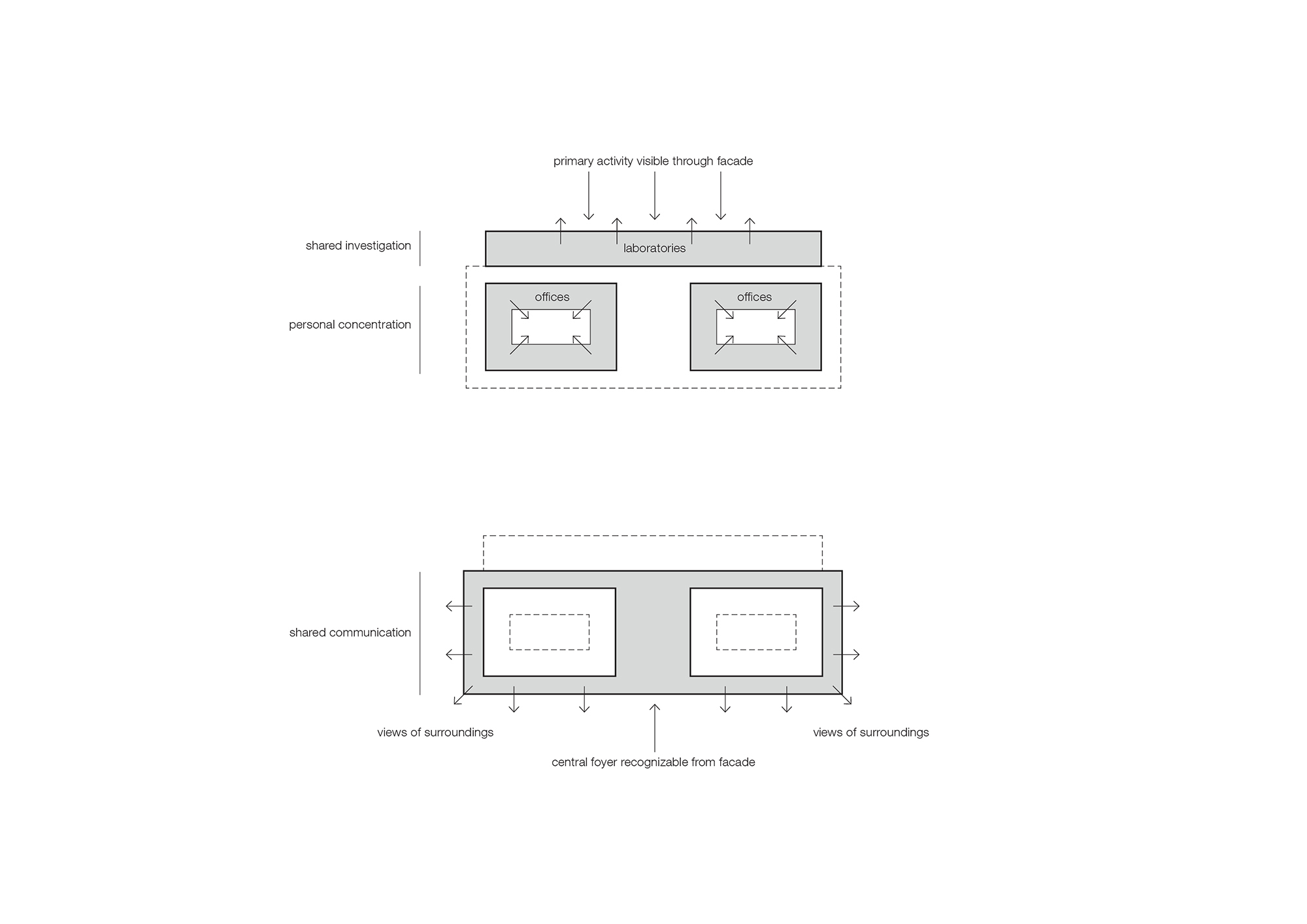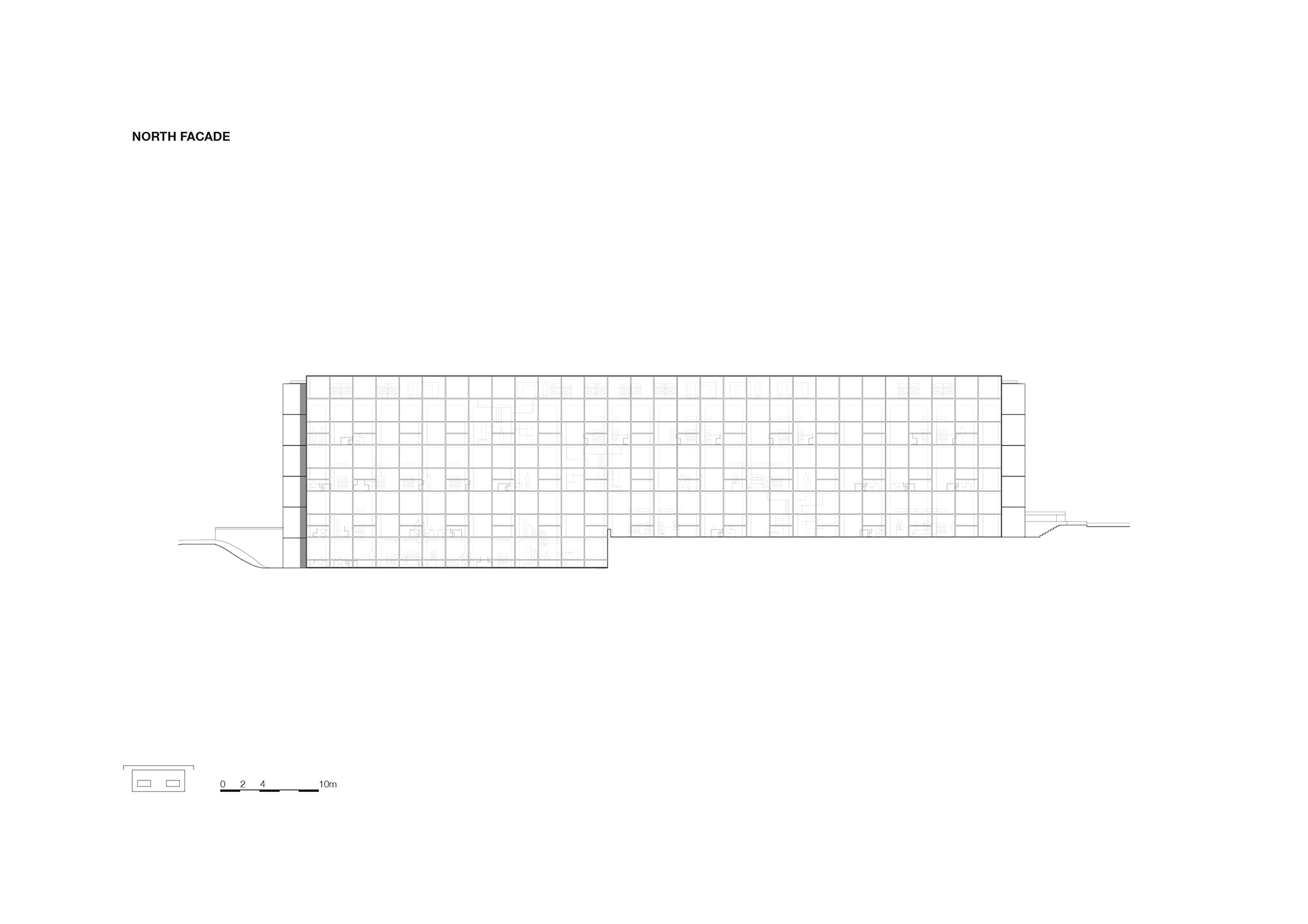 The building is unified by a consistent facade treatment. The rectangles and deep recesses of the front extend around the corners to the side facades and continue all the way to the end corners. The inclusive frontage strategy unites the complementary approaches and activities that coexist within the institution.
