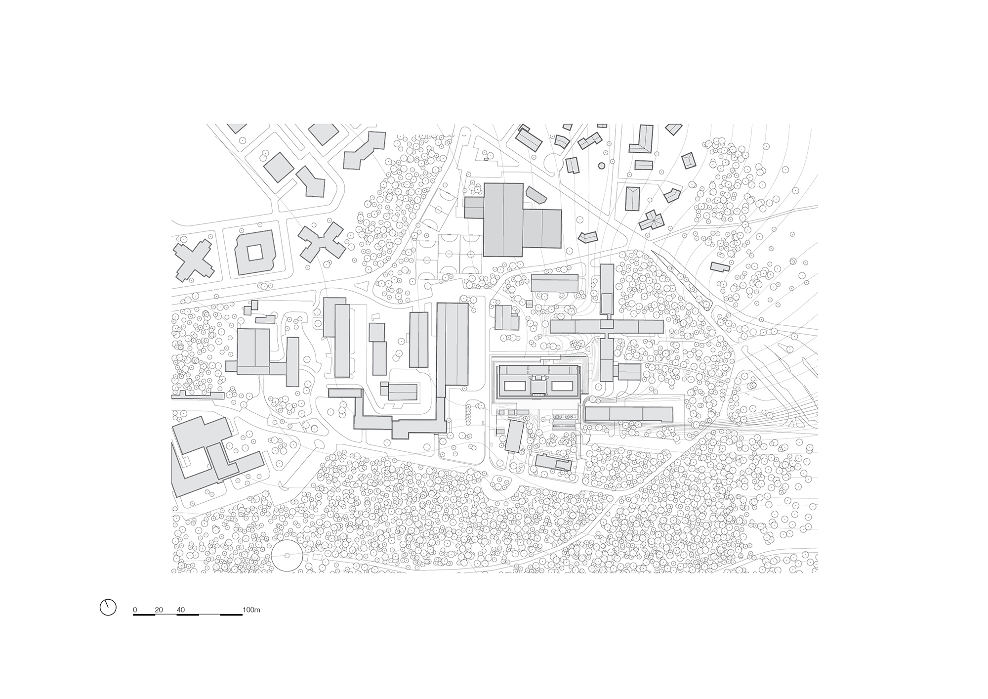 While the laboratories, which scarcely admit daylight, are situated on the long, north-facing side of the building behind a sleek curtain wall, the southern facade houses the office areas, where sturdily stacked concrete posts and lintels form a pattern of rectangles. The grid stands out for its glazed, niche-like infills, set 80 centimetres deep into the facade. The vast floor-to-ceiling windows offer stunning views of the surrounding landscape. The entrance, situated in the middle of this facade, is made immediately evident by the deviation of pattern and the glazed entryway, which has been lightly brought forward.