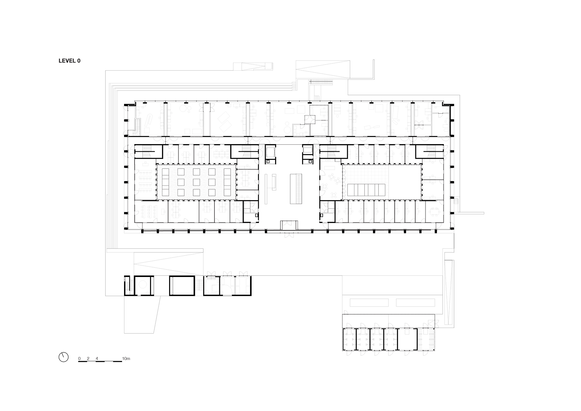 In the office areas, corridors run immediately behind the facades, across all the floors, and the working spaces are situated around two spacious courtyards that provide natural light and have been strategically designed for purposes that require a certain degree of privacy.