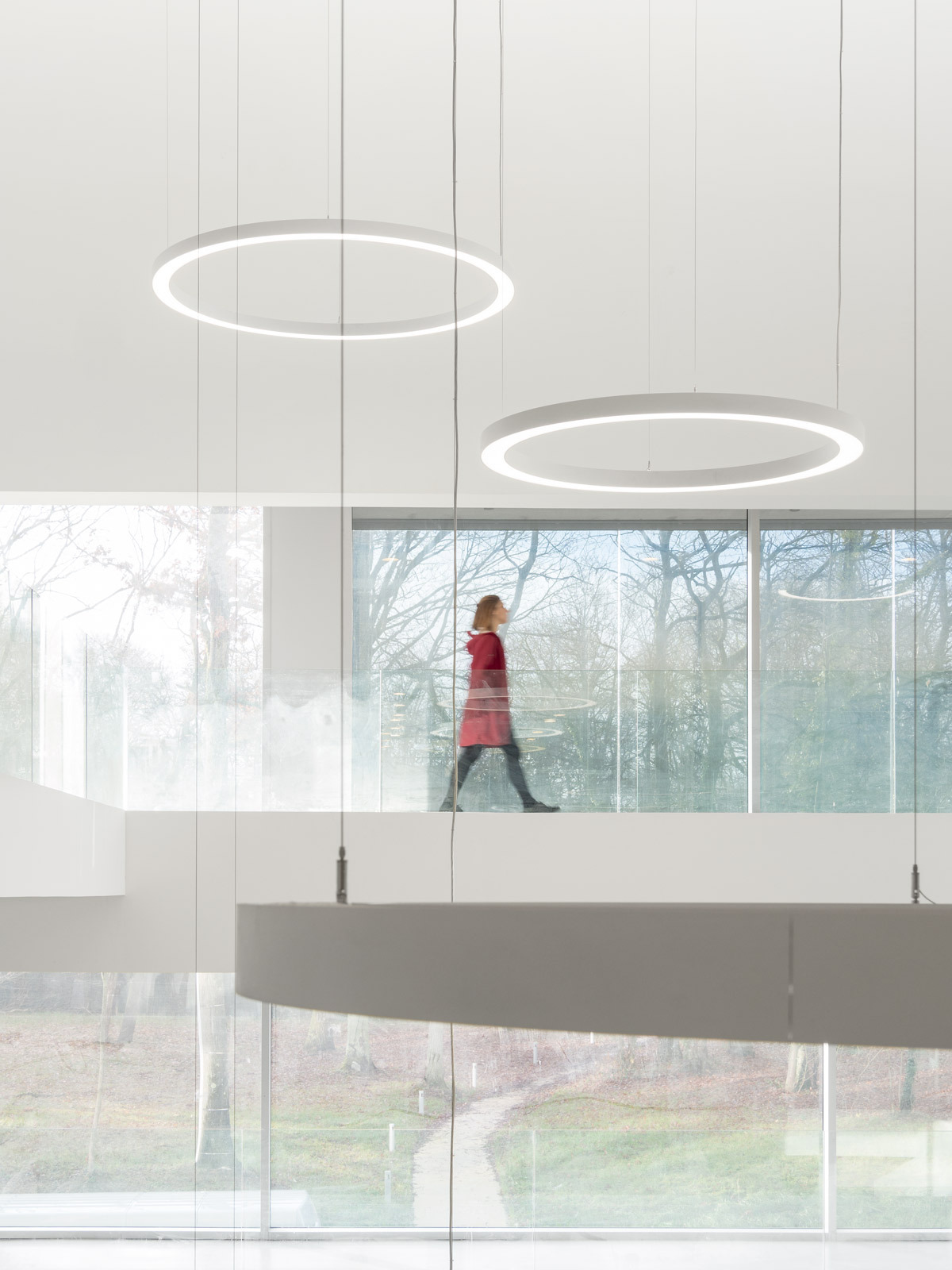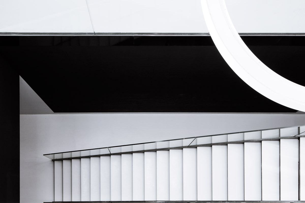 Entering the building, a clear white space unfolds and extends up to the roof. Daylight floods the atrium through the facade and a large skylight. The atrium features a reception desk, a cafeteria and a wide staircase descending to laboratories and the parking garage. To the right of the entrance, a library wall stretches over two storeys, connected by an enclosed spiral steel staircase. Pointing upwards, rectangular balconies project into the space as comfortable settings for conversations and exchange of ideas. The cohesive combination of daylight, spaciousness and sightlines creates a grand spatial effect.