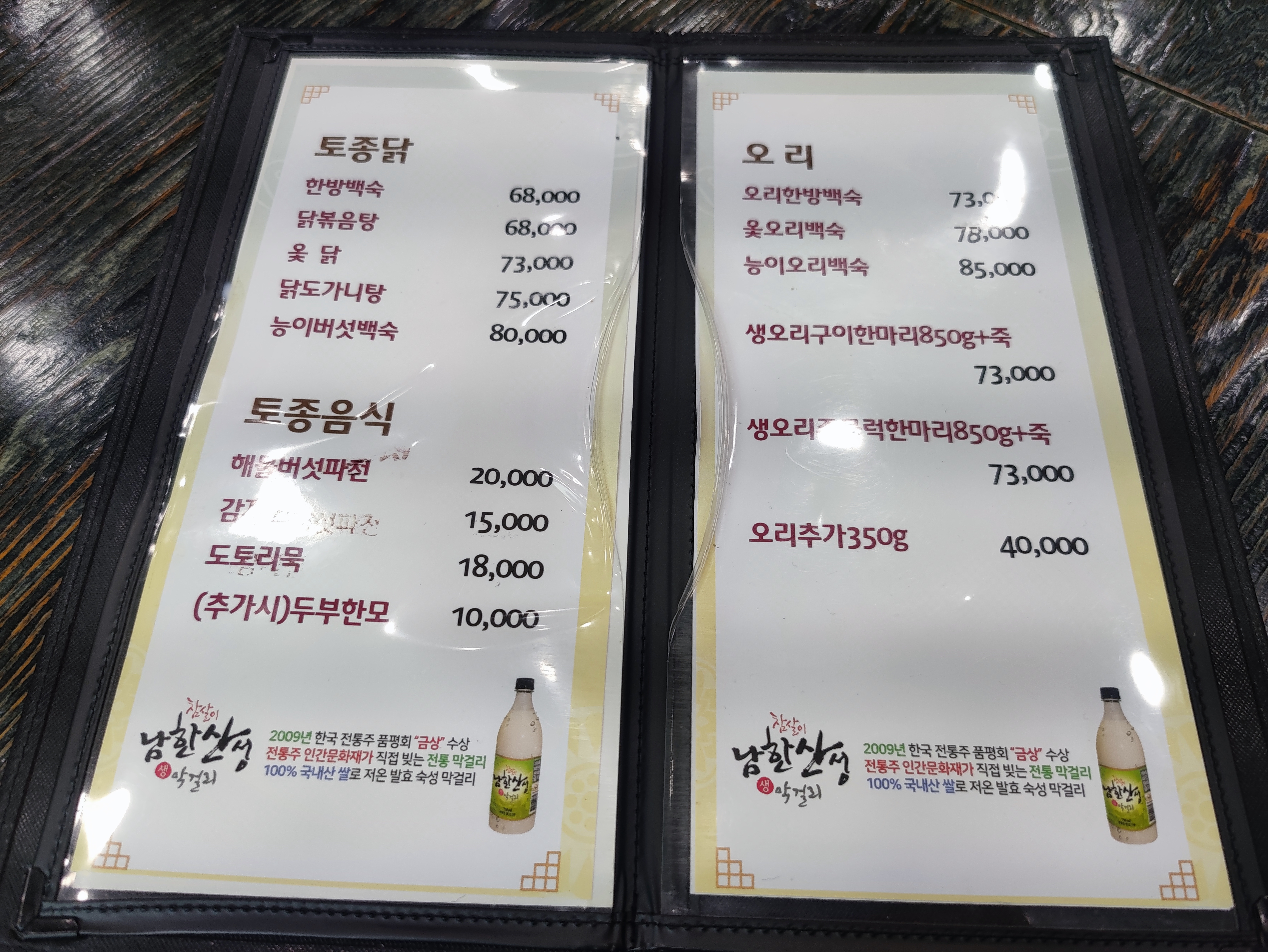 메뉴는 기본 닭백숙 6만8천원부터 8만원까지.