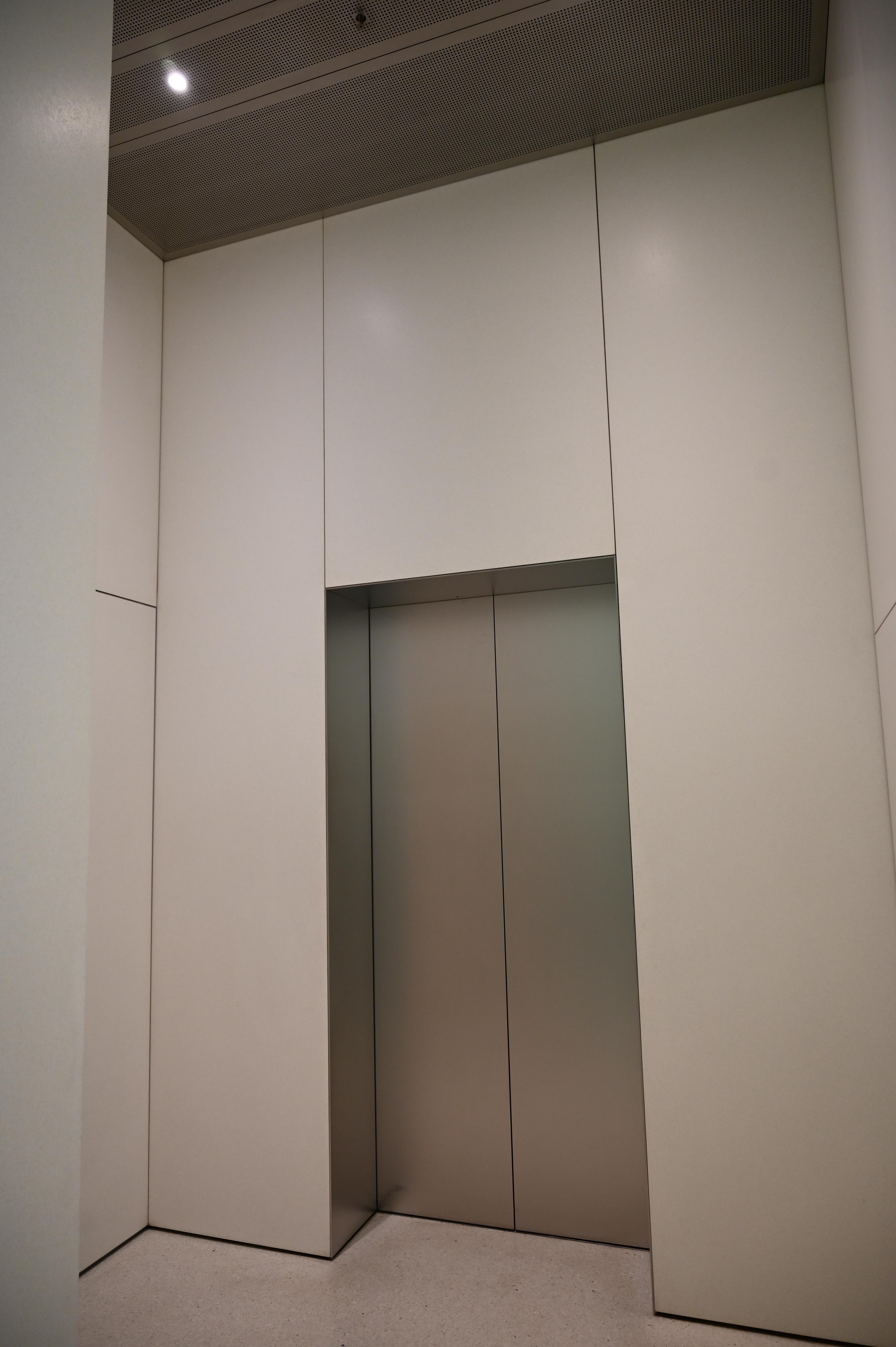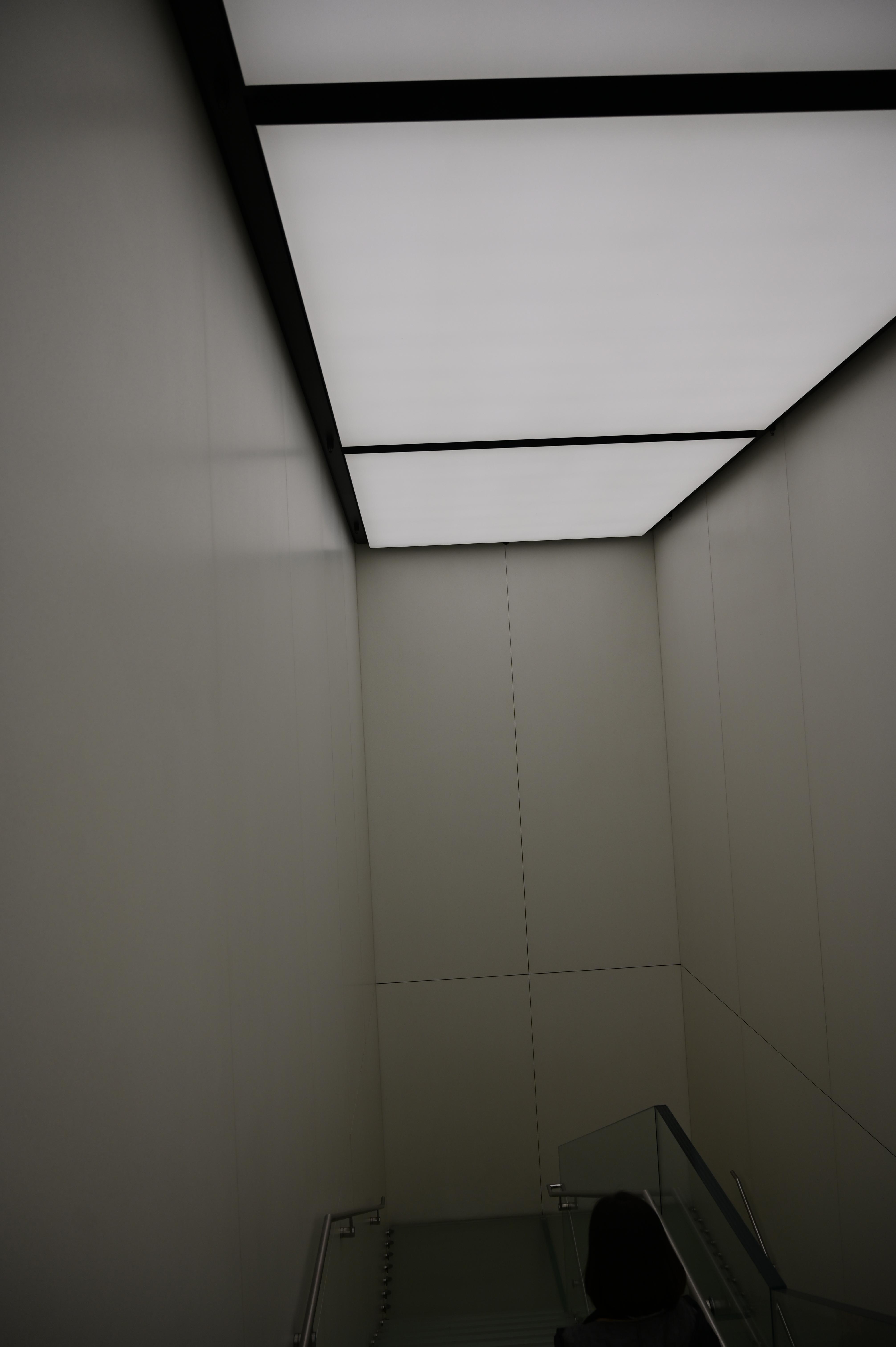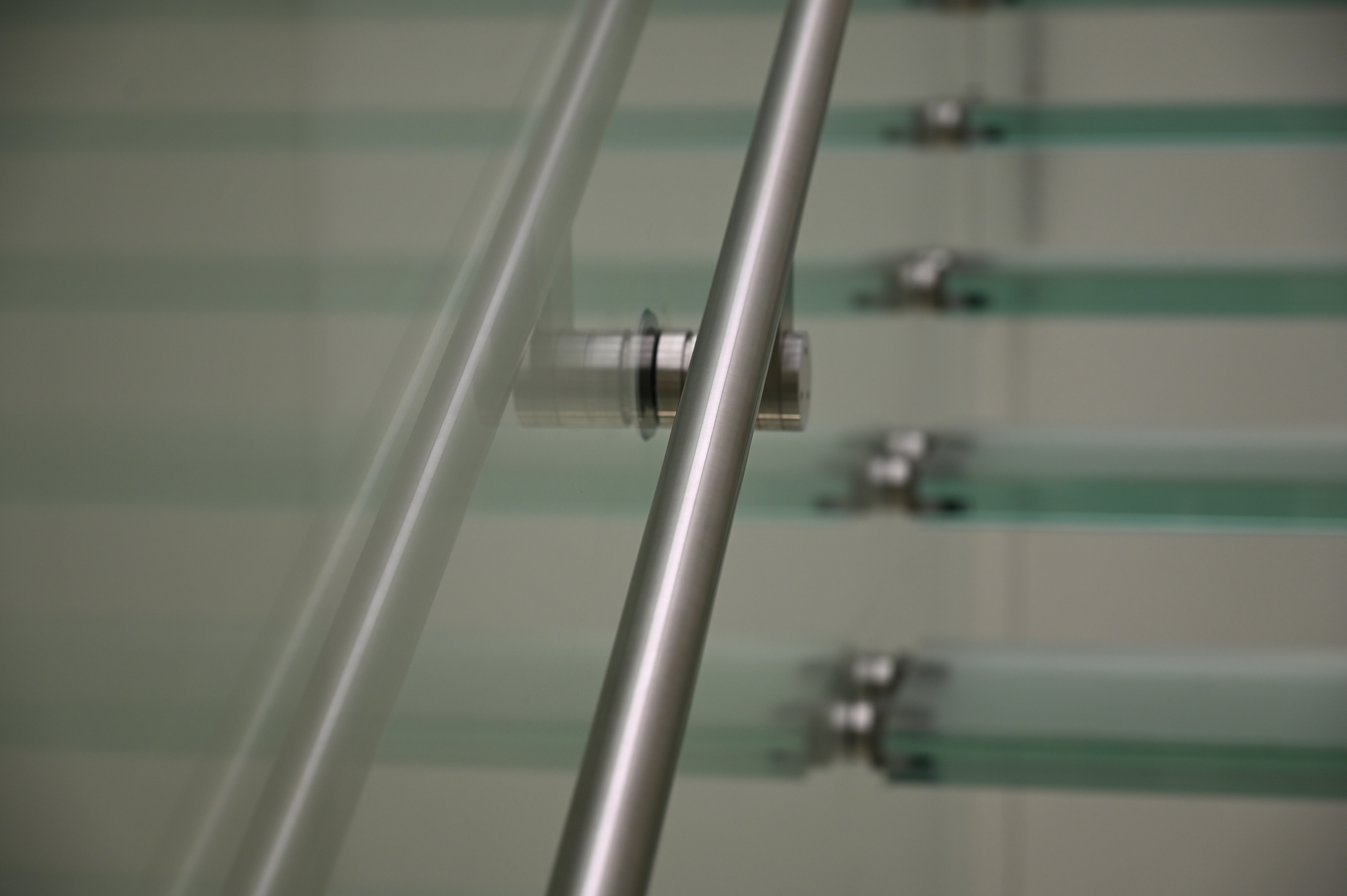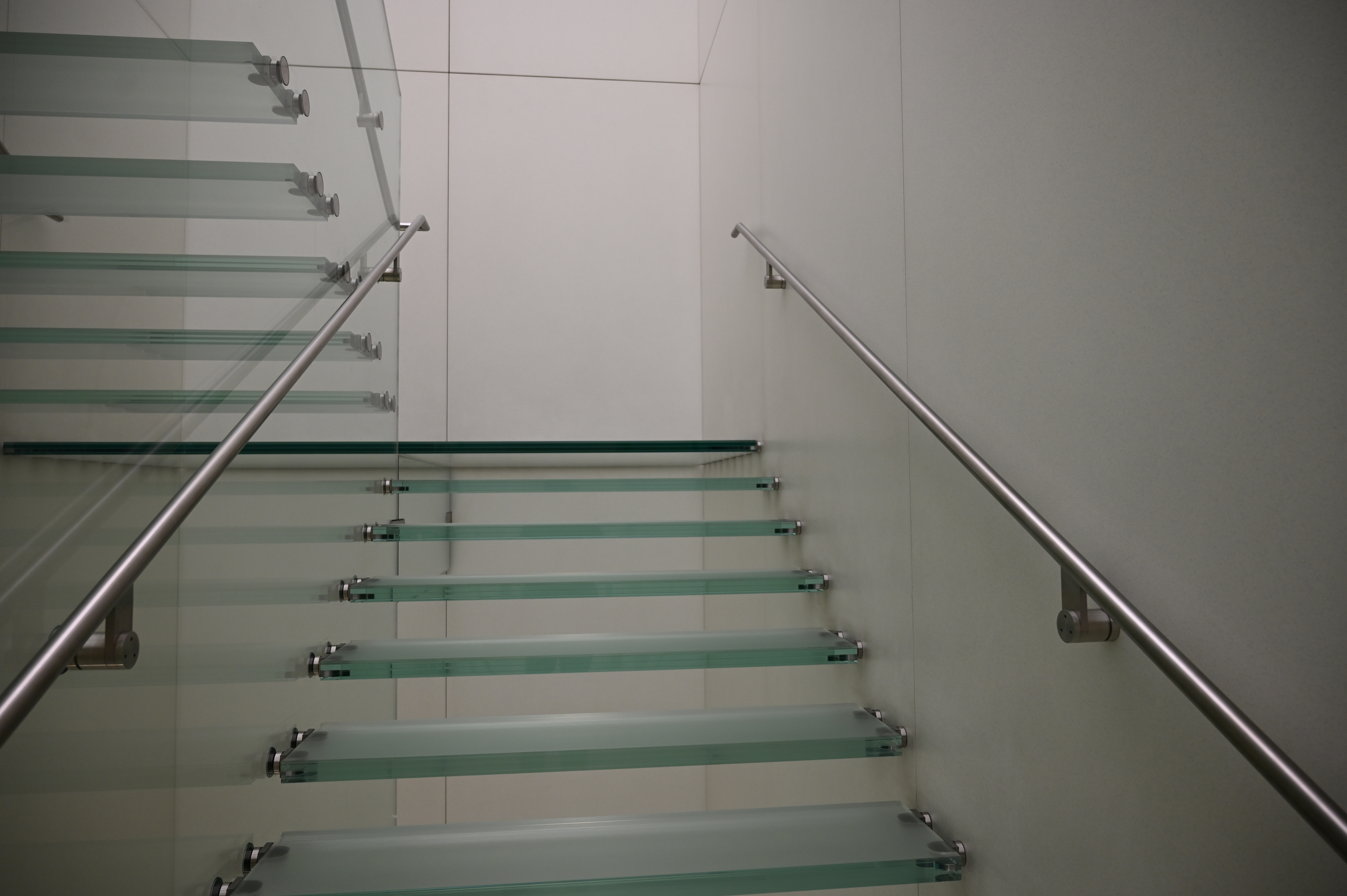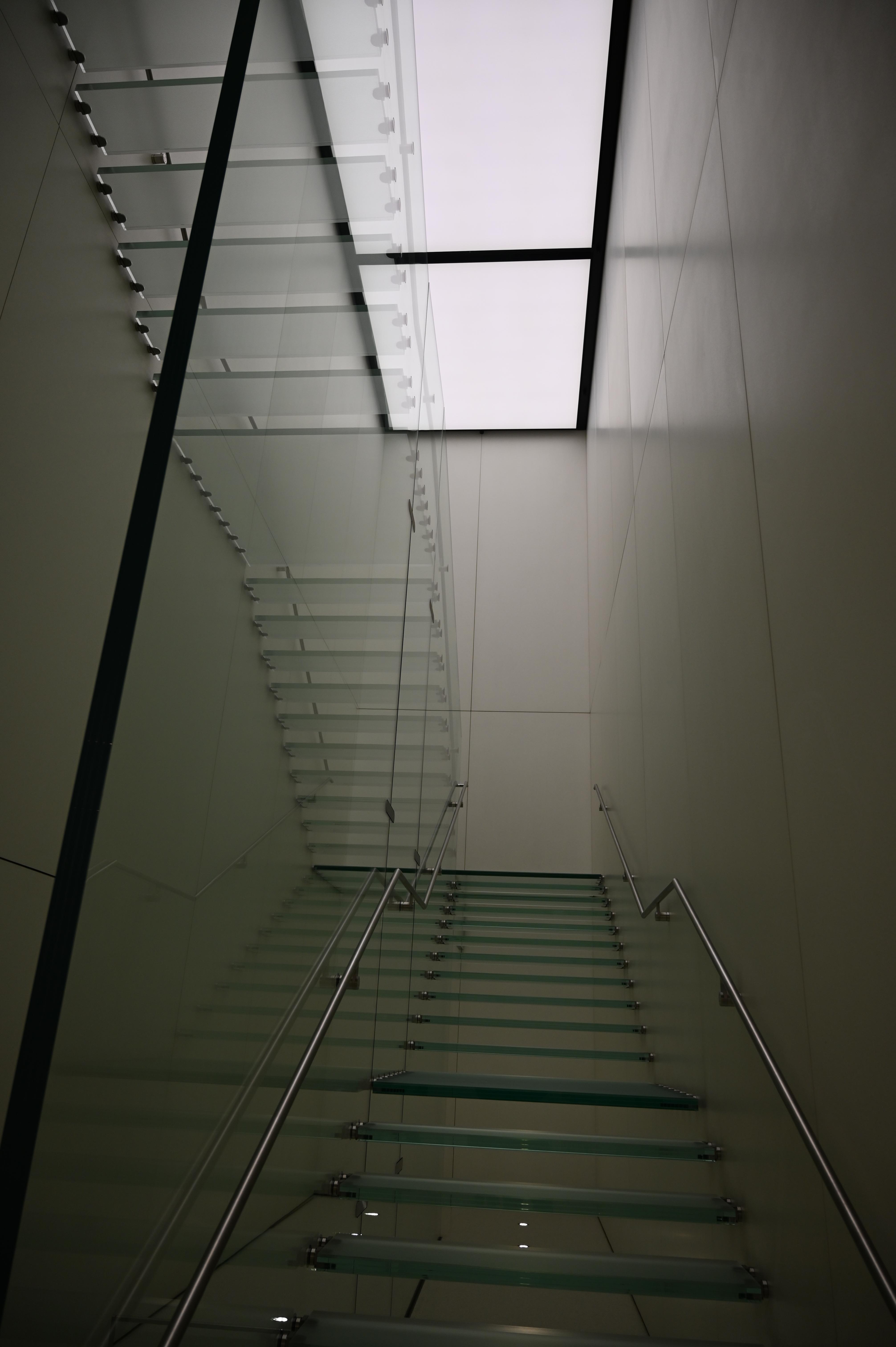 두꺼운 강화유리로 난간 및 지지대를 세우고, 반투명한 강화유리판으로 계단판을 두었다.