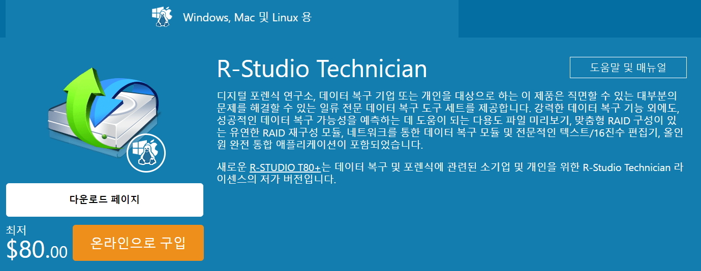 특히 T80+ 버전같은 경우 80$라는 비교적 저렴한 가격에 구입할 수 있다.(그냥 R-Studio Technician은 899$다...)