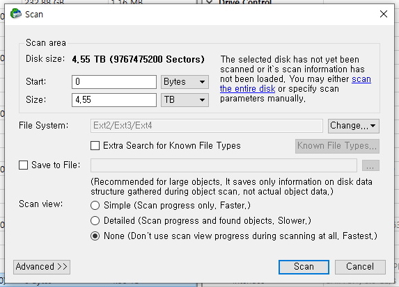 5TB 외장하드의 실제 데이터영역인 4.55TB를 모두 스캔하지를 못 하는 것이다.