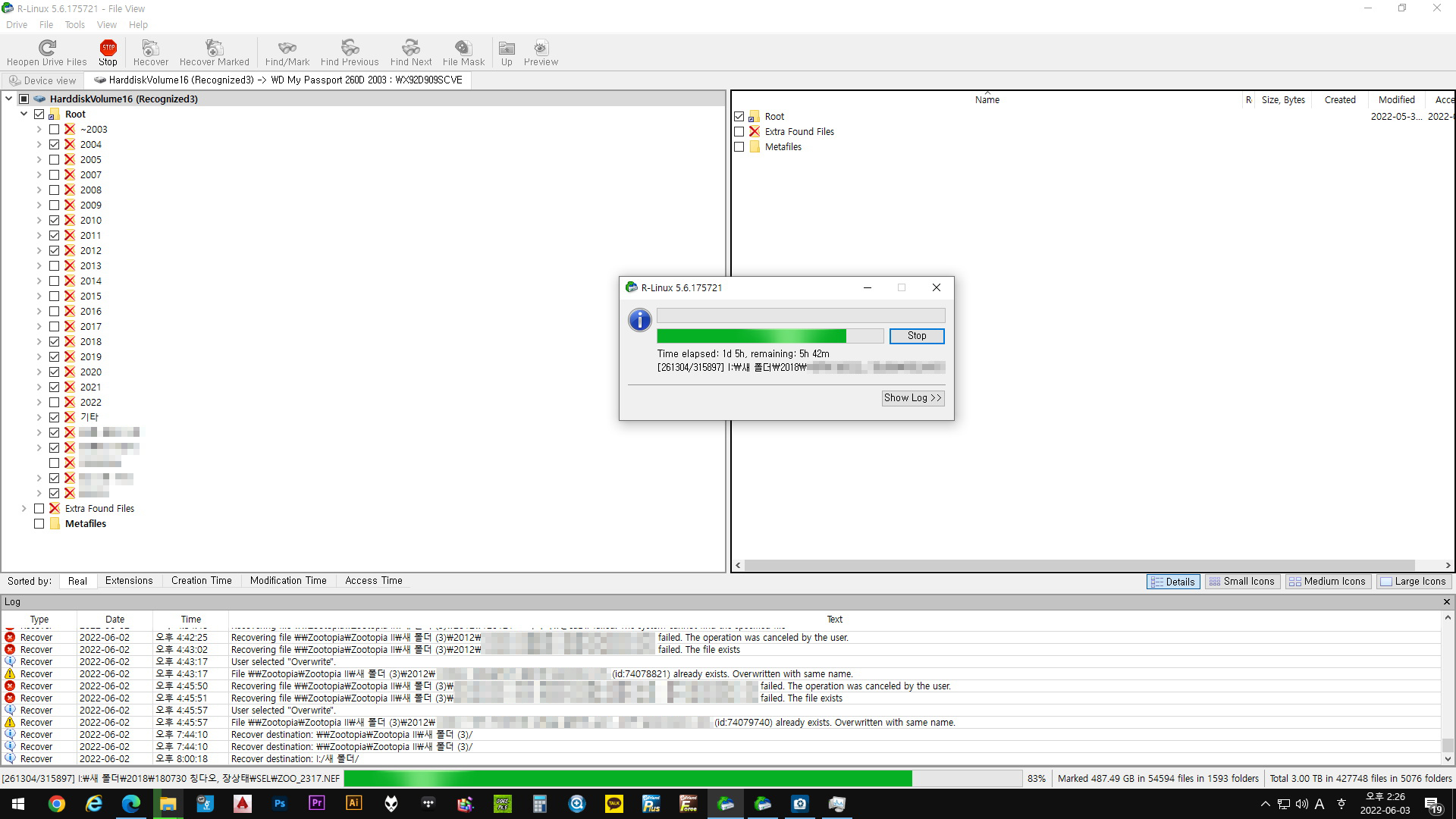 2번째 R-Linux로 스캔을 완료하였고, 1차에서 복구가 안 된 부분은 이미 손상된 부분이라 복구가 어려운 것으로 보인다.