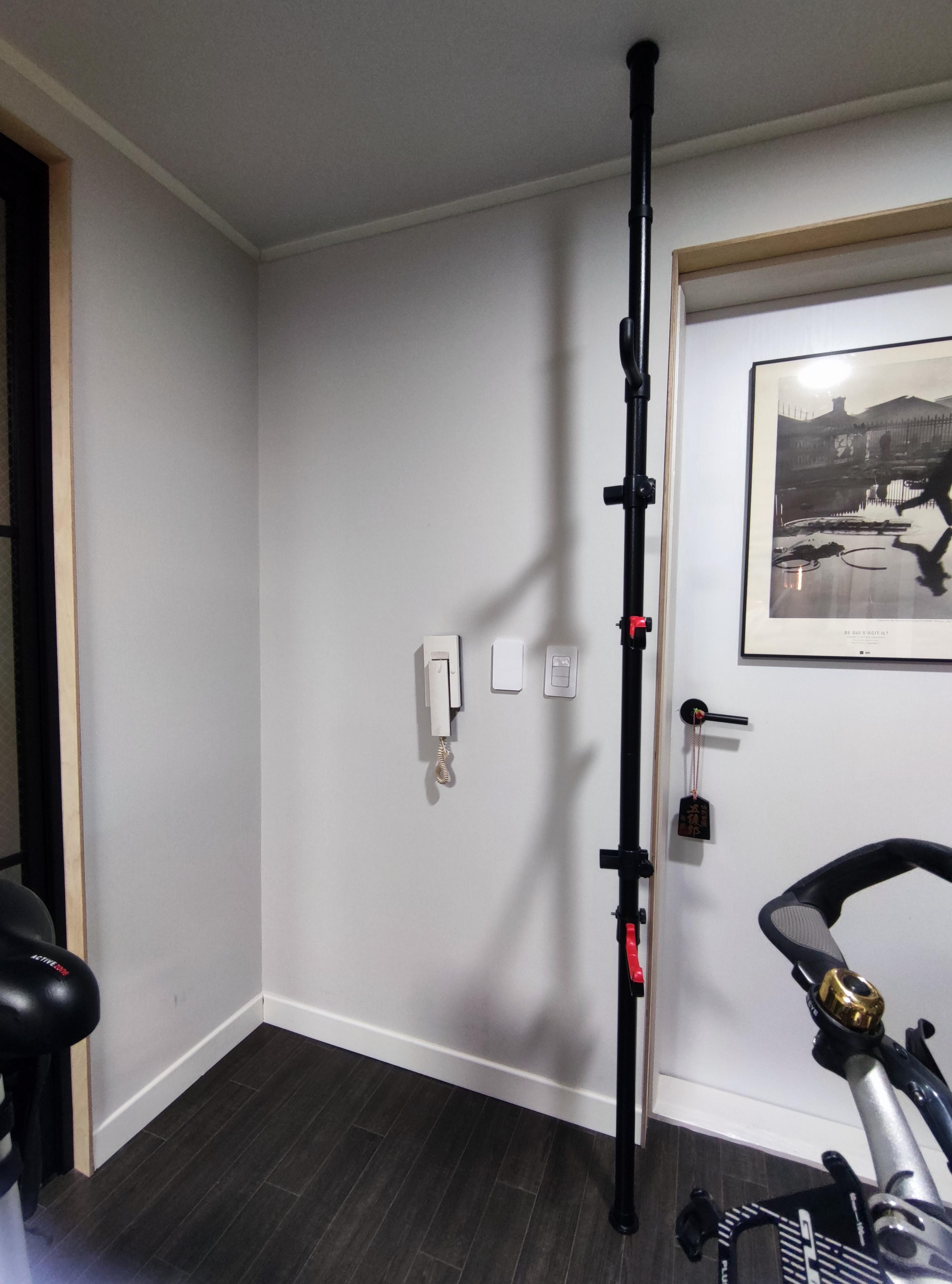 천장까지 봉을 밀어올려 자리를 고정한다.