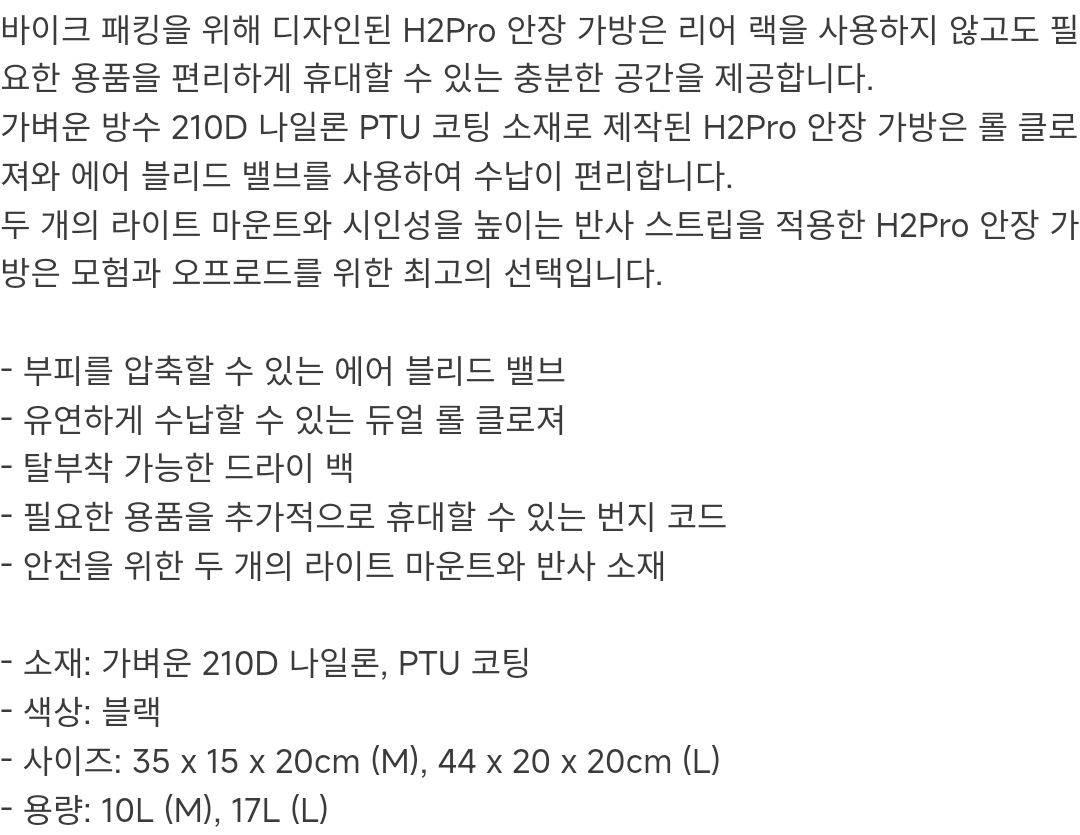 이외에도 H2Pro 핸들바 가방, 액세서리 가방 등이 있으나 여기서부터는 이미 로드의 영역이 아니기 때문에(앞서 안장 가방도 마찬가지) 자세히 소개하지는 않기로 한다.
