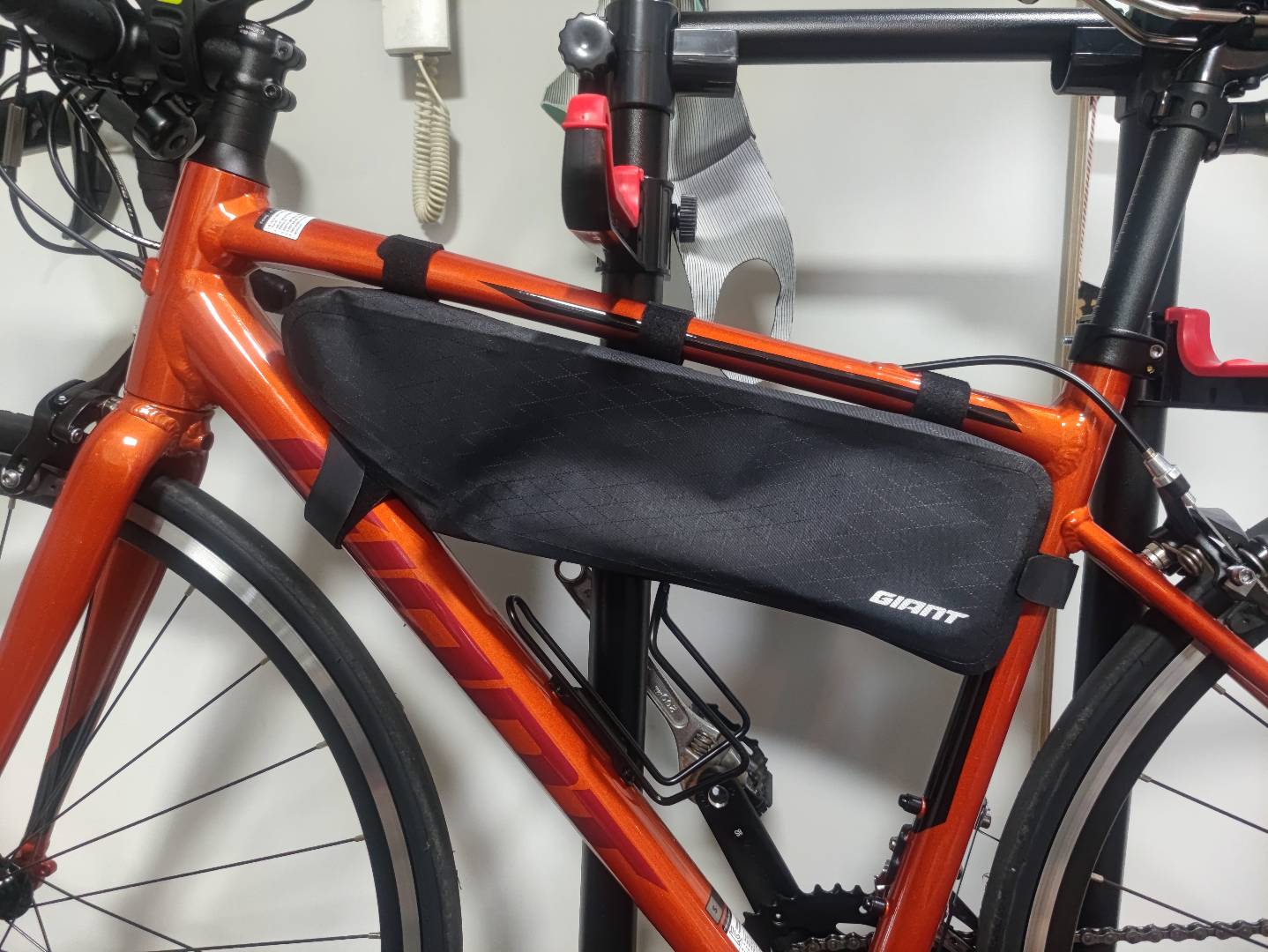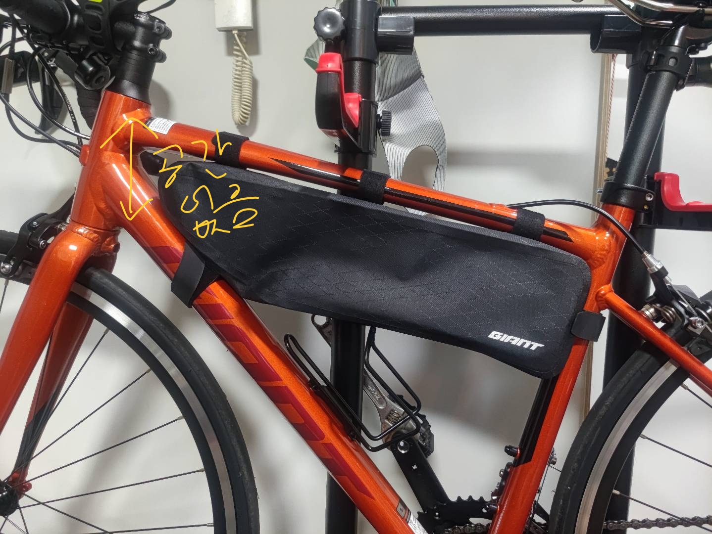 SCR2 같은 경우 스템의 위치와 싯포스트 사이의 거리가 약 46cm 내외로 측정되는데, 프레임 가방 L 사이즈의 길이가 46.5cm라서 장착 가능하지 않을까 하는 생각이 들었다.