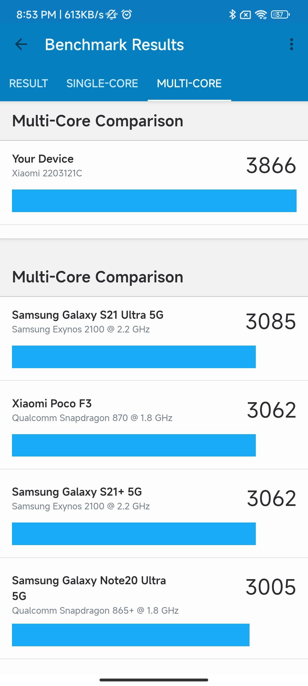 실제 긱벤치 점수는 갤럭시 S22 울트라보다 훨씬 높게 나온다고 한다.