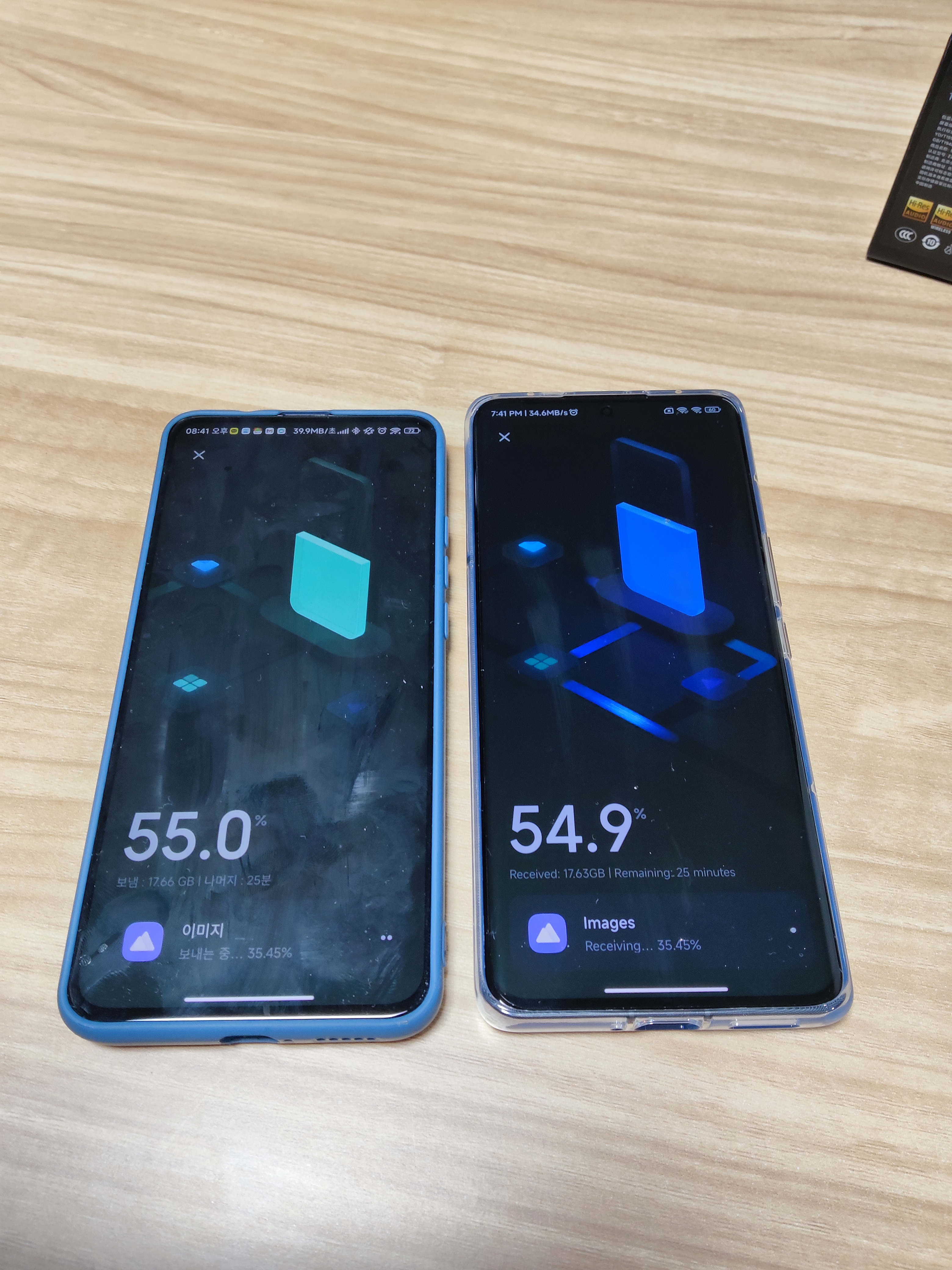 전송이 먼저 완료되고, 수신은 10여분 후에 완료된다.