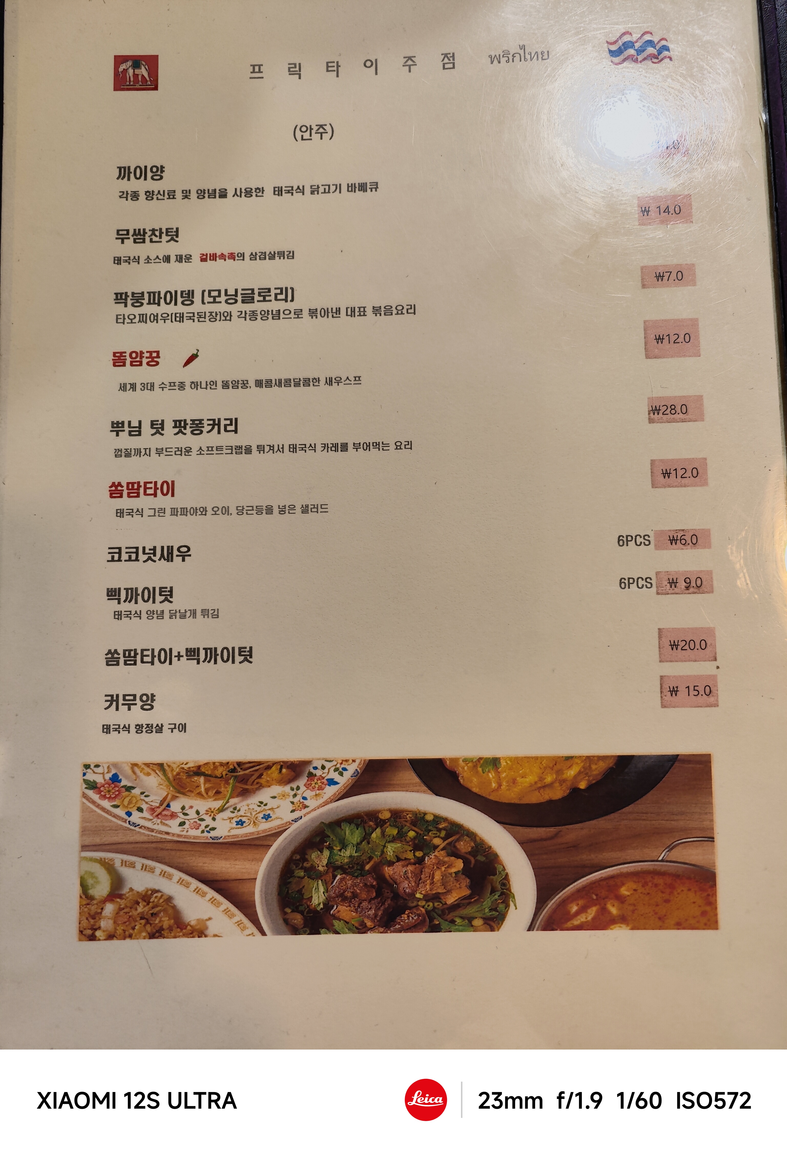요리 쪽으로 똠얌꿍-누들과는 다른 요리임-, 소프트 쉘 크랩-방금 탈피를 마친 게를 요리하면 껍질이 딱딱하지 않고 말랑말랑해서 튀기면 그대로 씹어 먹을 수 있게 요리된다-을 넣은 뿌님 텃 팟퐁커리(뿌팟퐁커리로 많이 판매된다), 닭고기 요리와 돼지고기 요리가 있는데, 술 안주로 제격인 듯 하다.