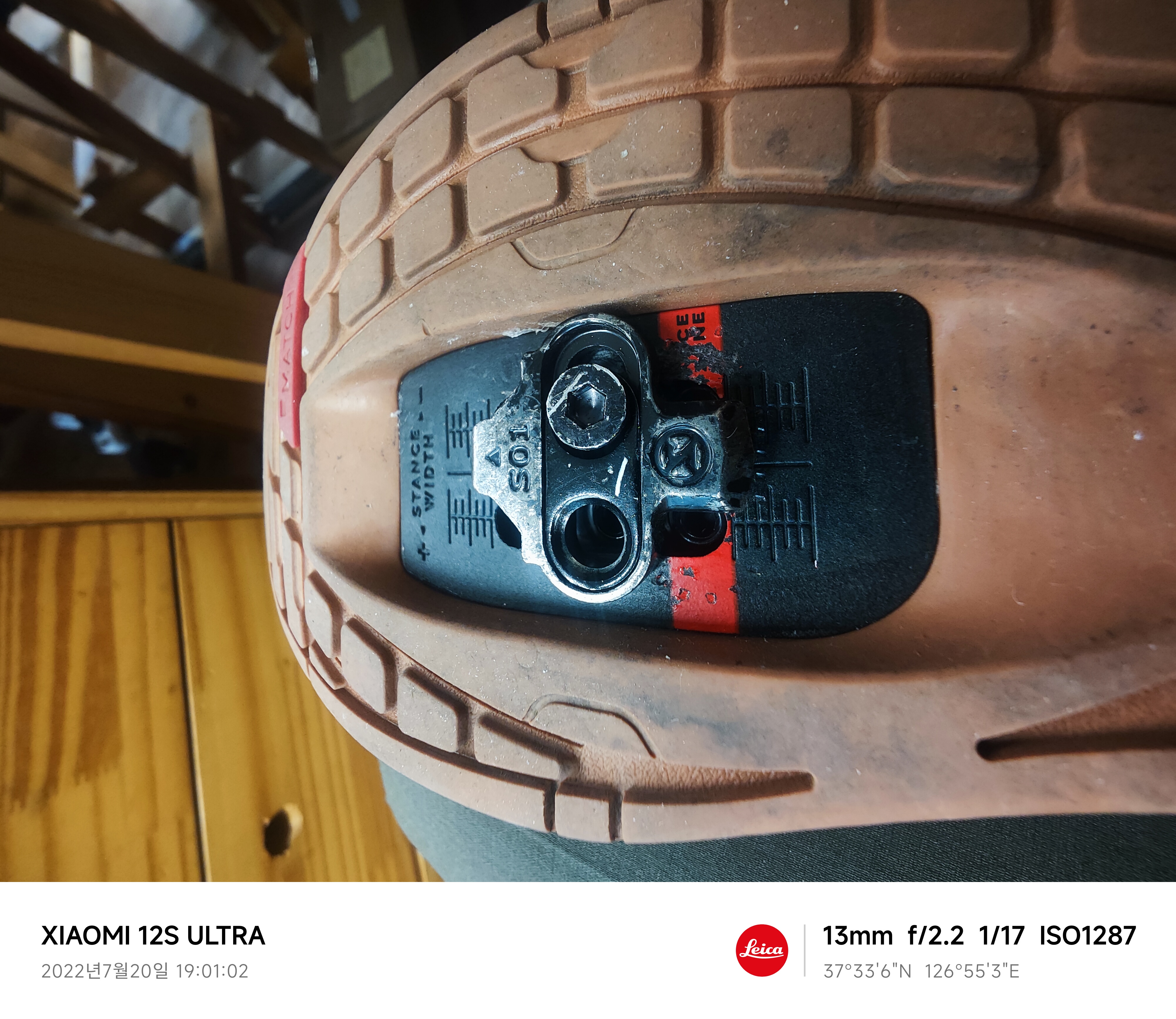 마운트를 발바닥 가운데 위치까지 당긴 후에 앞쪽 마운트에 클릿을 설치하면 적당~한 위치에 잡히더라.