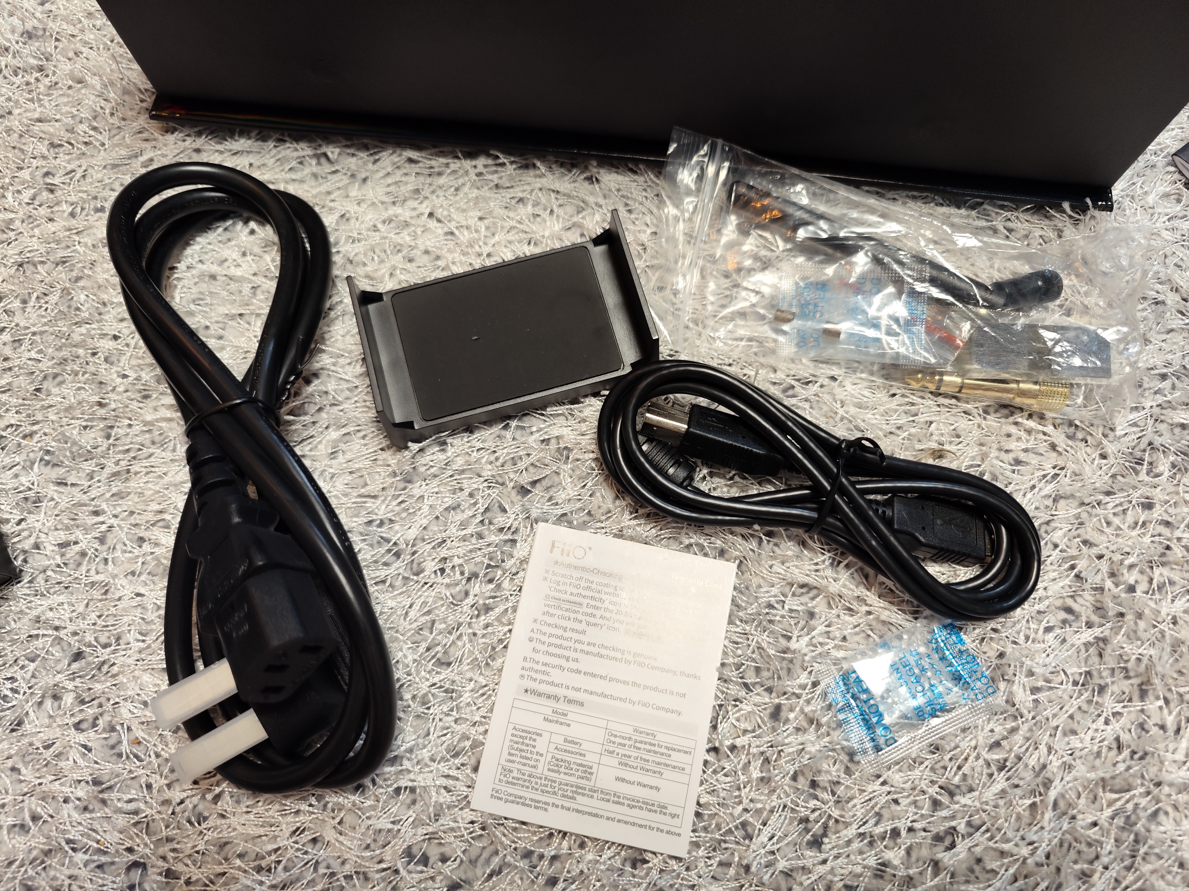 전원케이블, USB A to B 케이블, 스탠드, 블루투스 안테나, 3.5mm to 6.35mm 어댑터, 고무발, 여분의 퓨즈, 전압 스위치 고무캡 등이다.