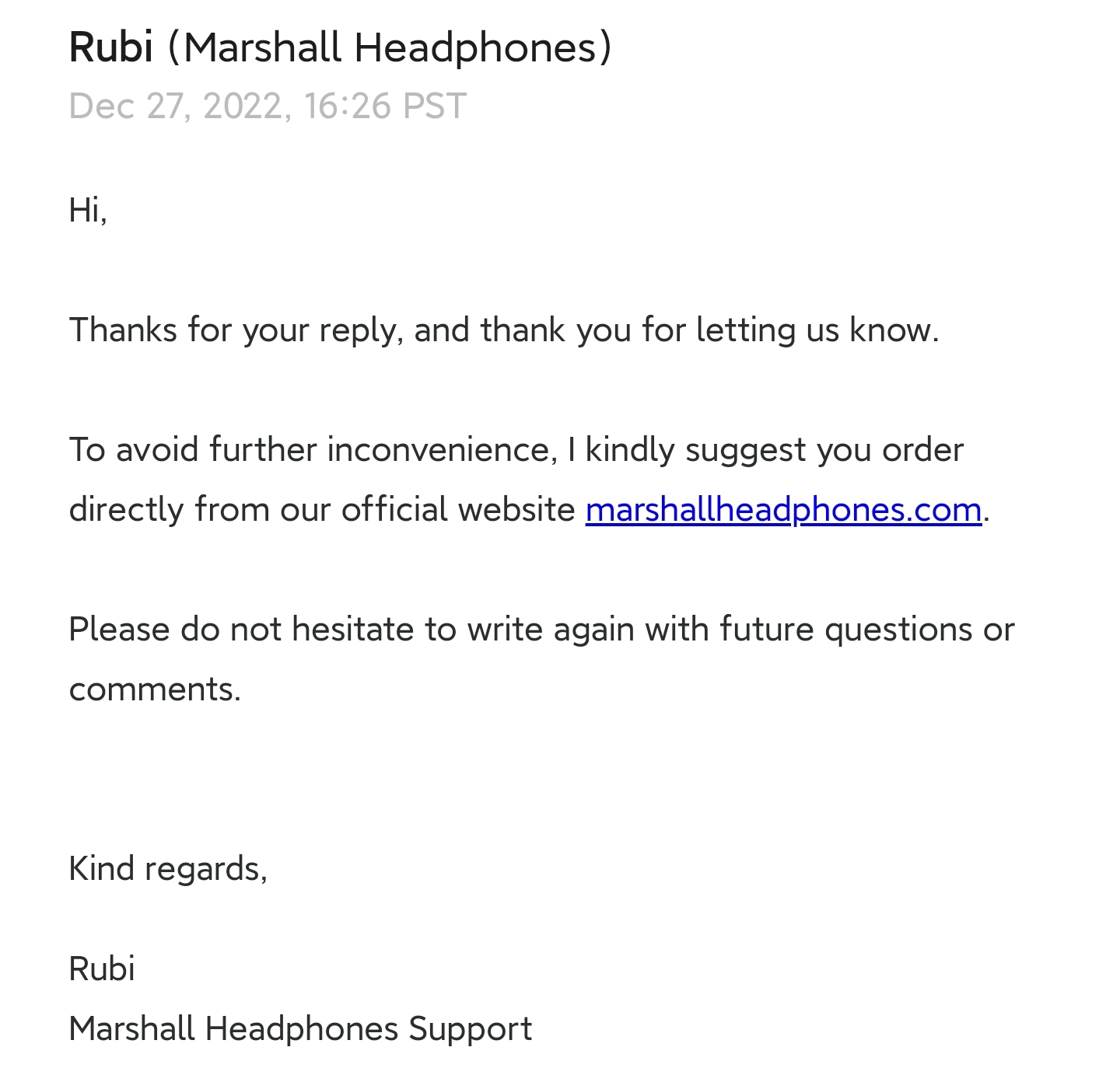 To avoid further inconvenience, I kindly suggest you order directly from our official website marshallheadphones.com.
