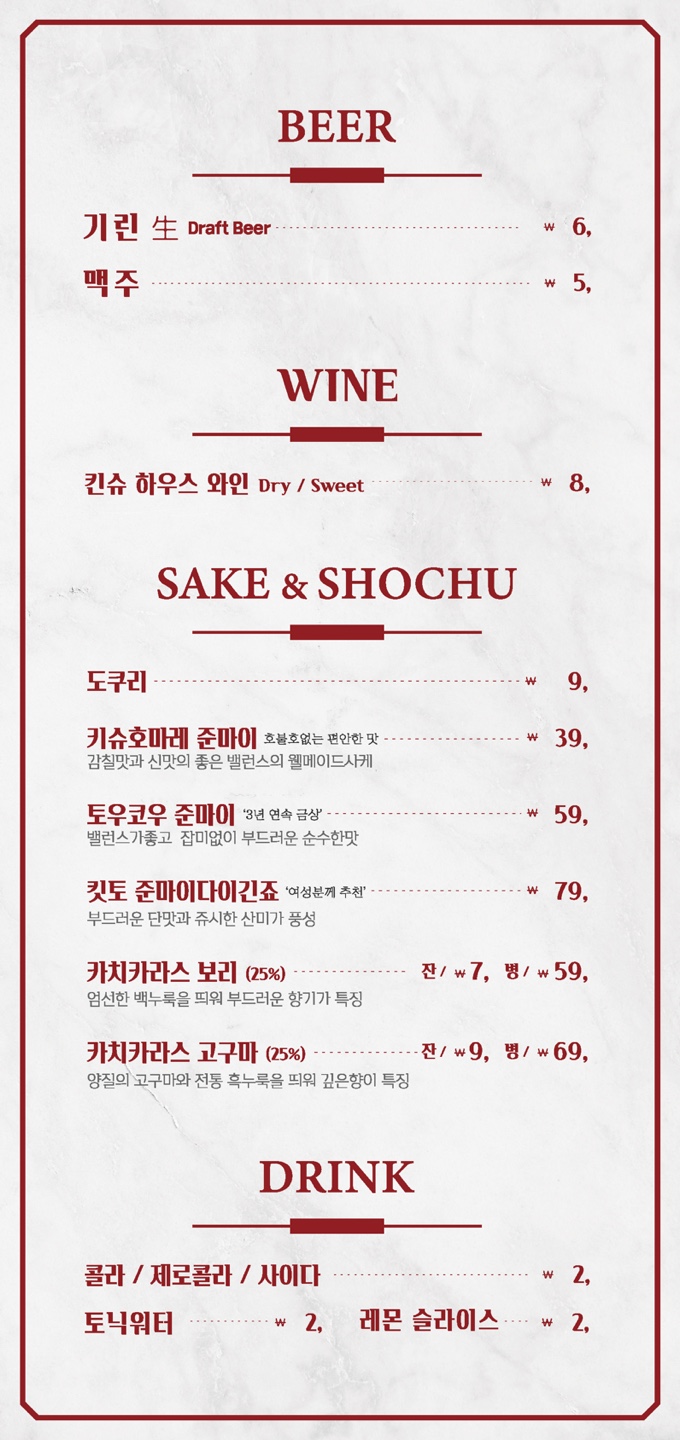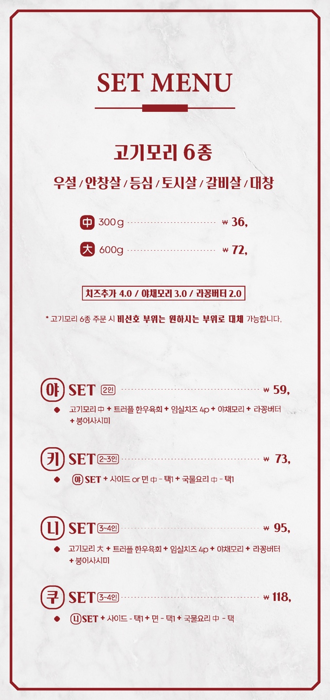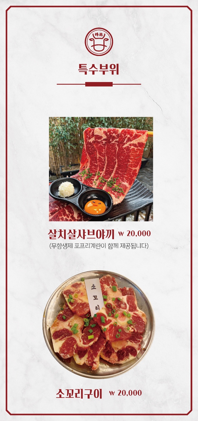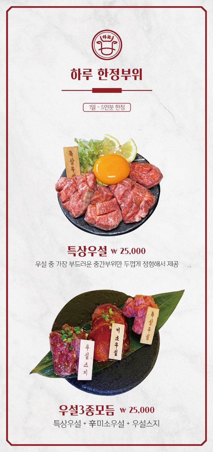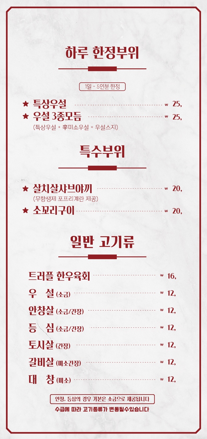 우설과 소꼬리 2가지 특수부위를 제외한 한우육회, 우설, 안창살, 등심, 토시살, 갈비살, 대창 까지 총 7개 메뉴가 메인 부위라고 볼 수 있다.