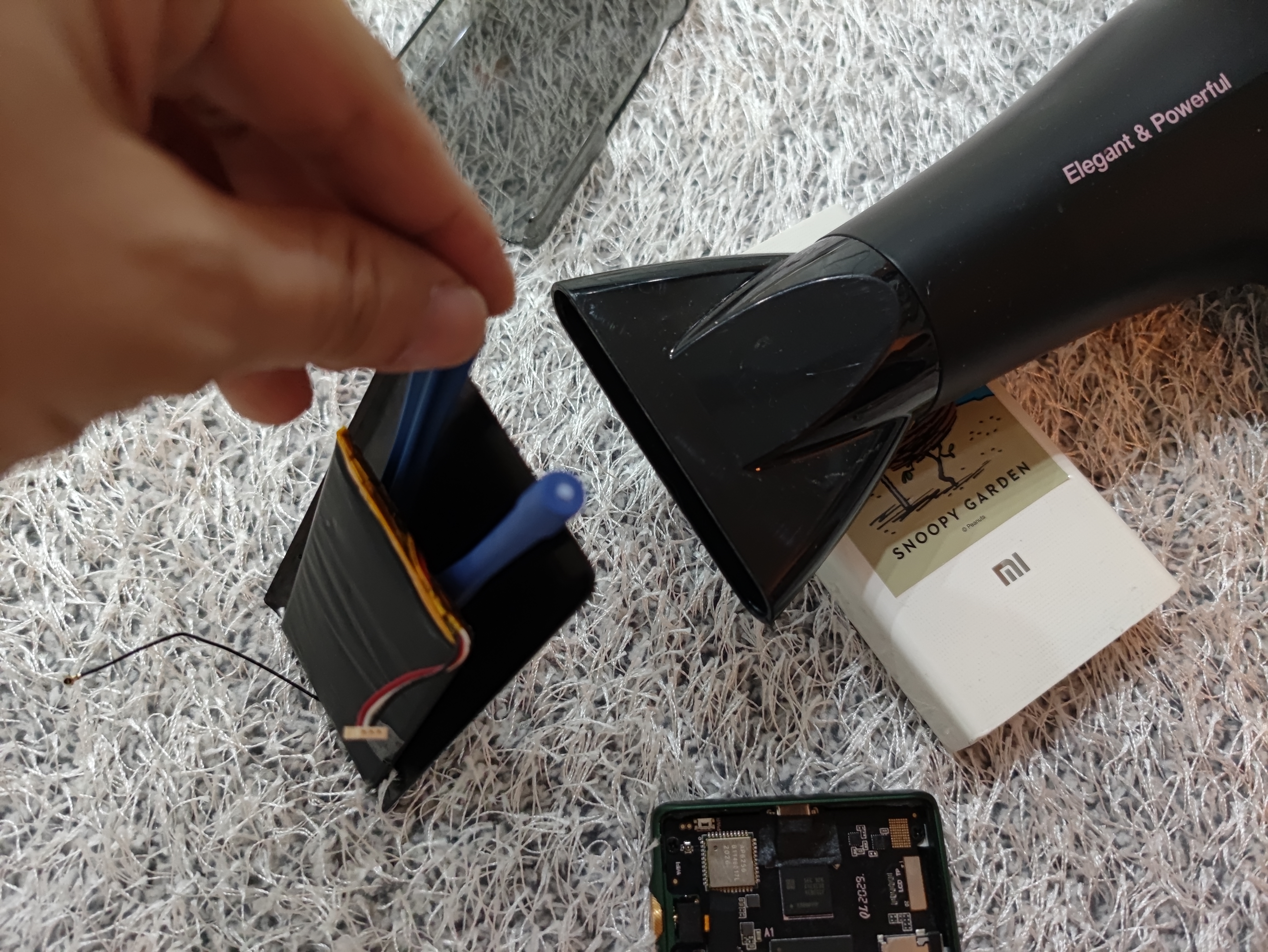 그러나 배터리는 여전히 뒷판에 붙어있으니 성능 좋은 헤어드라이기로 열을 가하고, 플라스틱 도구로 살살살살 사이에 꽂아주면 살살 떨어진다.