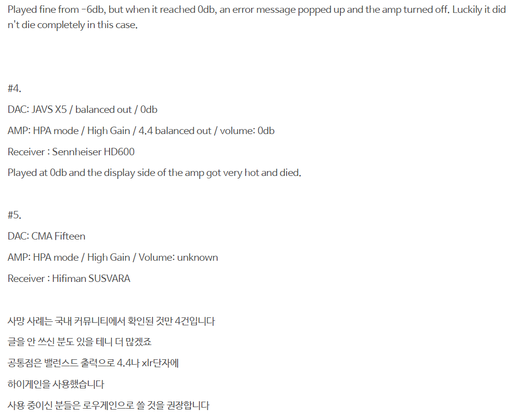 그러나 수집된 사례를 보면 0dB라는 최대 볼륨으로 재생한다던지 하는 이레귤러한 경우에 발생한 것이 대부분이다.
