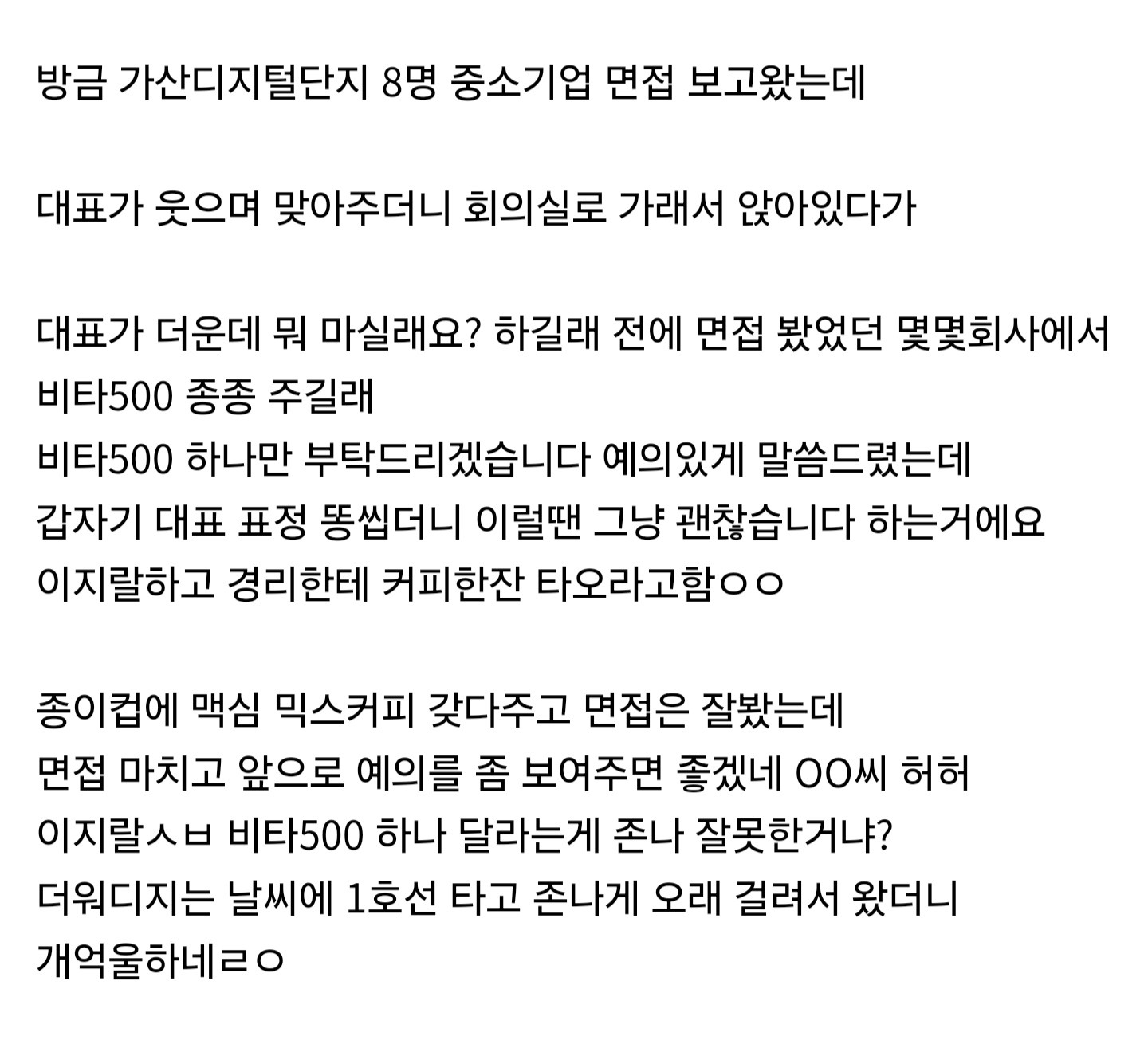 본인의 회사를 위해 기꺼이 일할 잠재적 의사가 있는 입사 지원자에게 마실 것 하나 제공할 의사가 없는 이 시대의 폐급 '기성 세대'의 표본이라 할 만하다.
