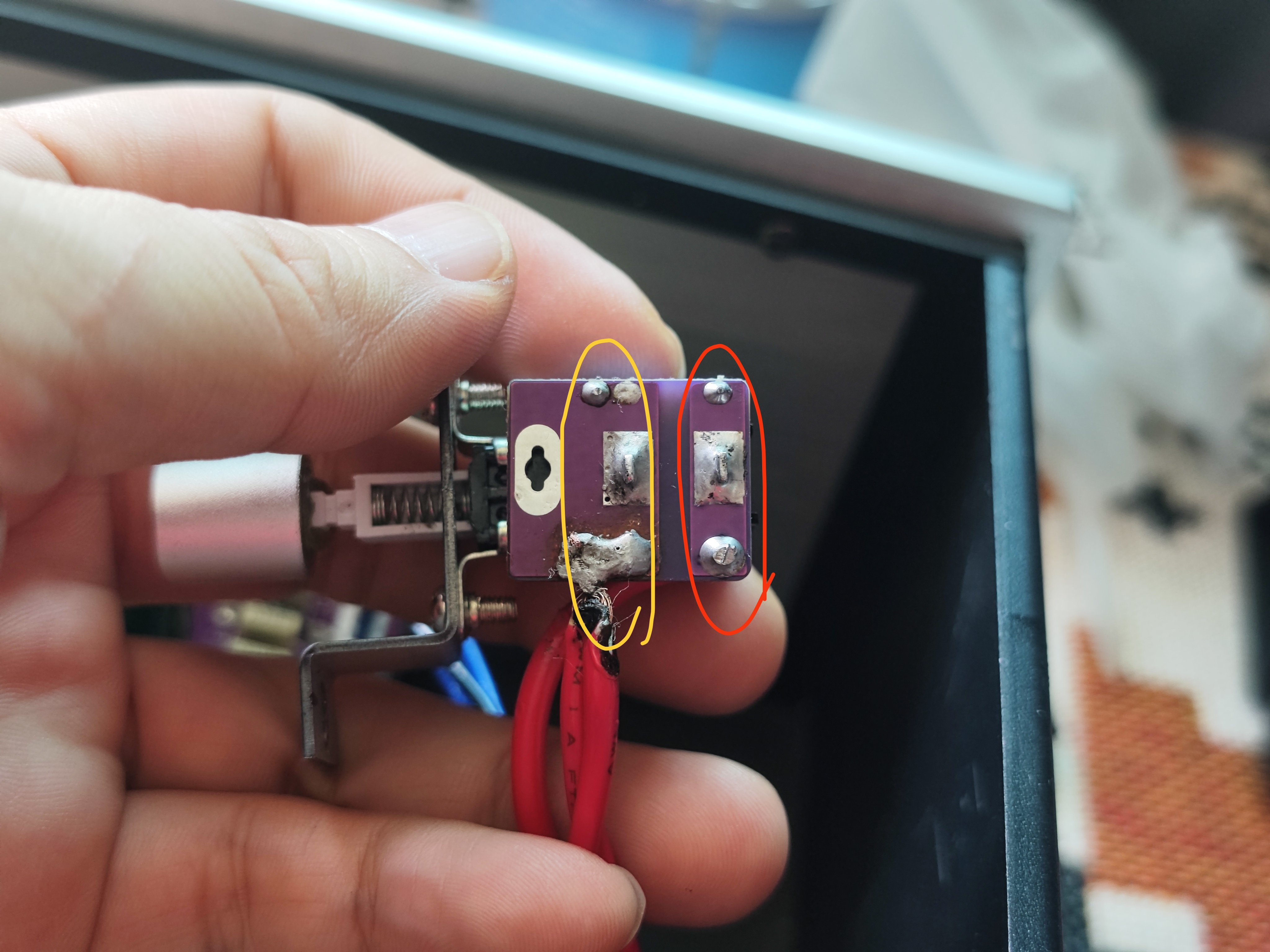 테스터기로 갖다대었을 때 빨간 원 안의 단자들끼리 대면 통전 사운드가 나오고, 마찬가지로 노란 원 안의 단자끼리 대면 통전 사운드가 나왔다.