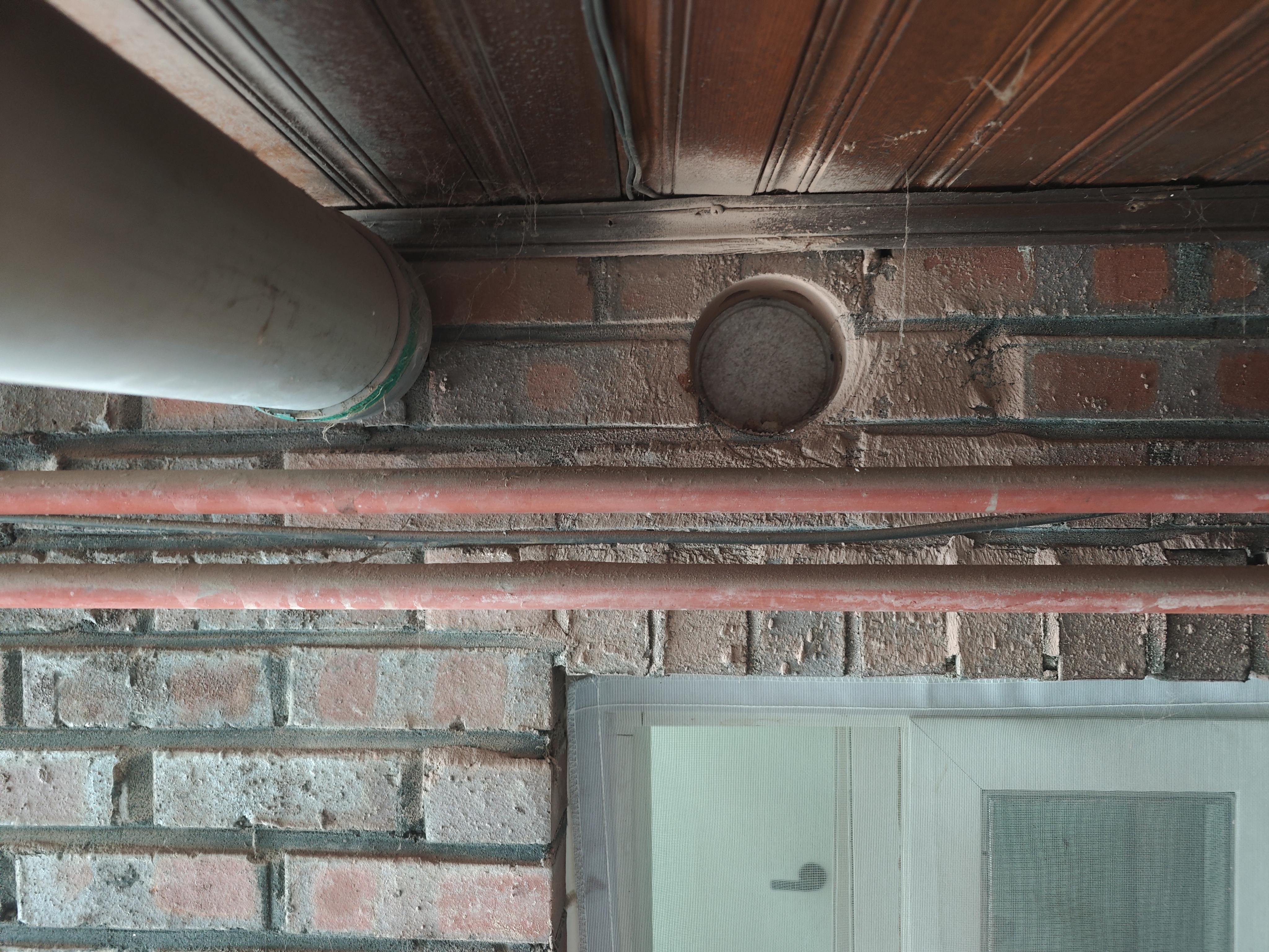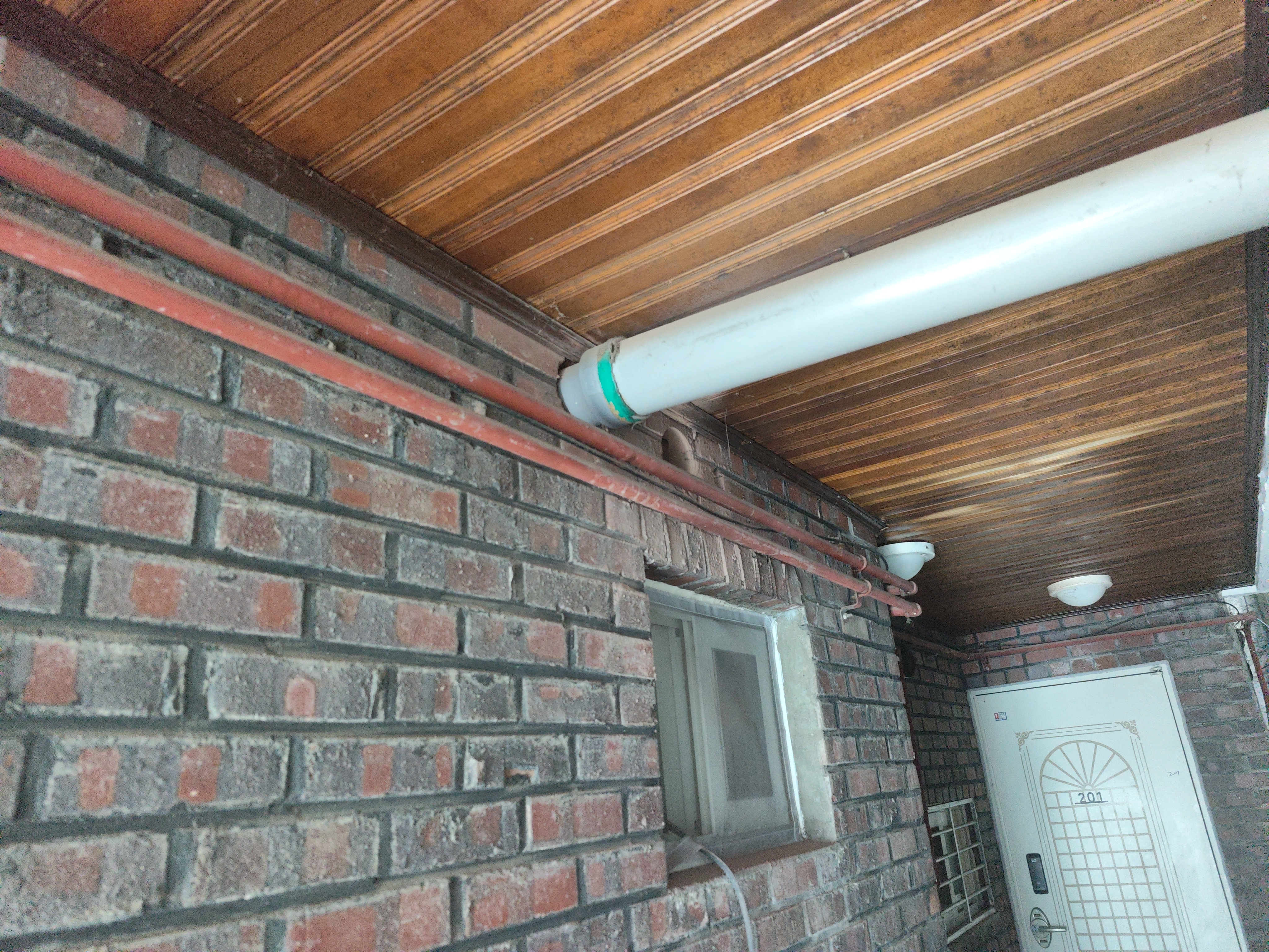 화장실 천장 내부에 기존에 연결되어 있던 배관을 찾았는데 알고보니 가운데 집 화장실에서 뽑은 환기 배관이었다.