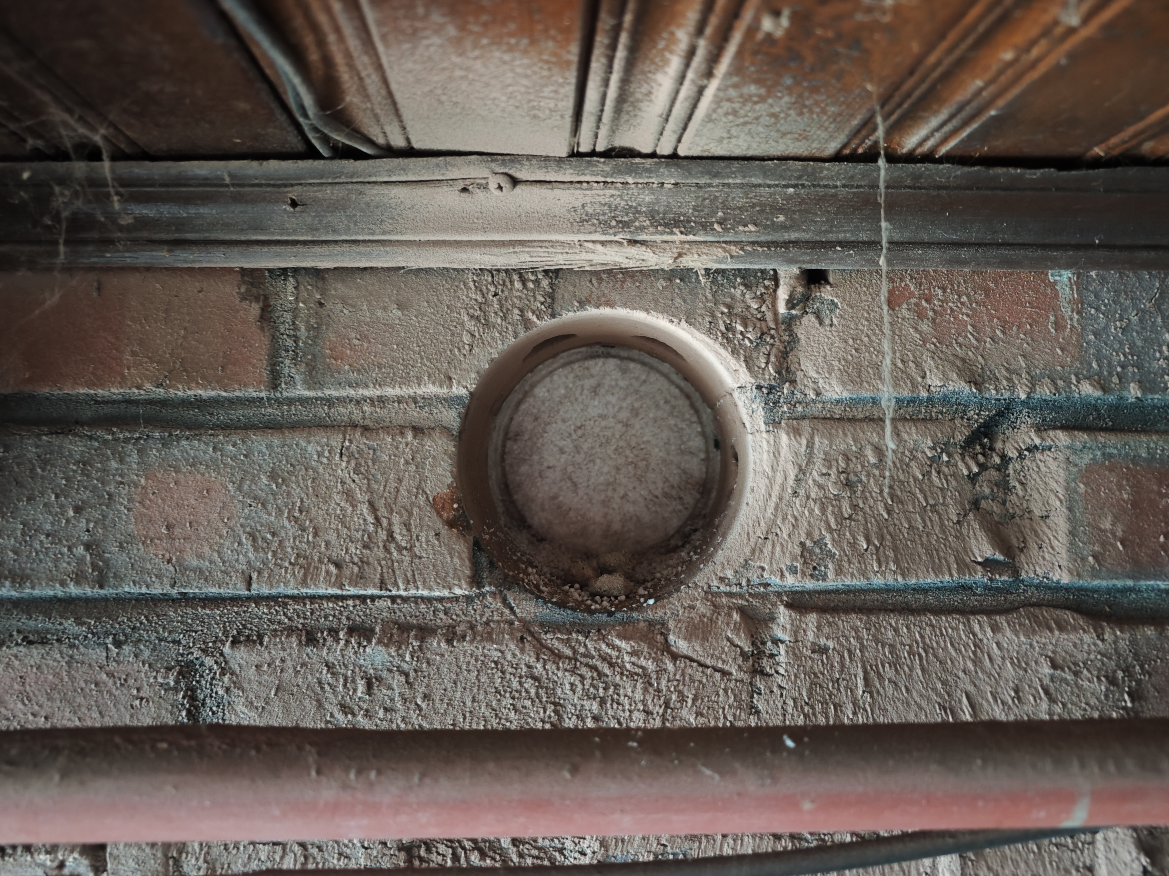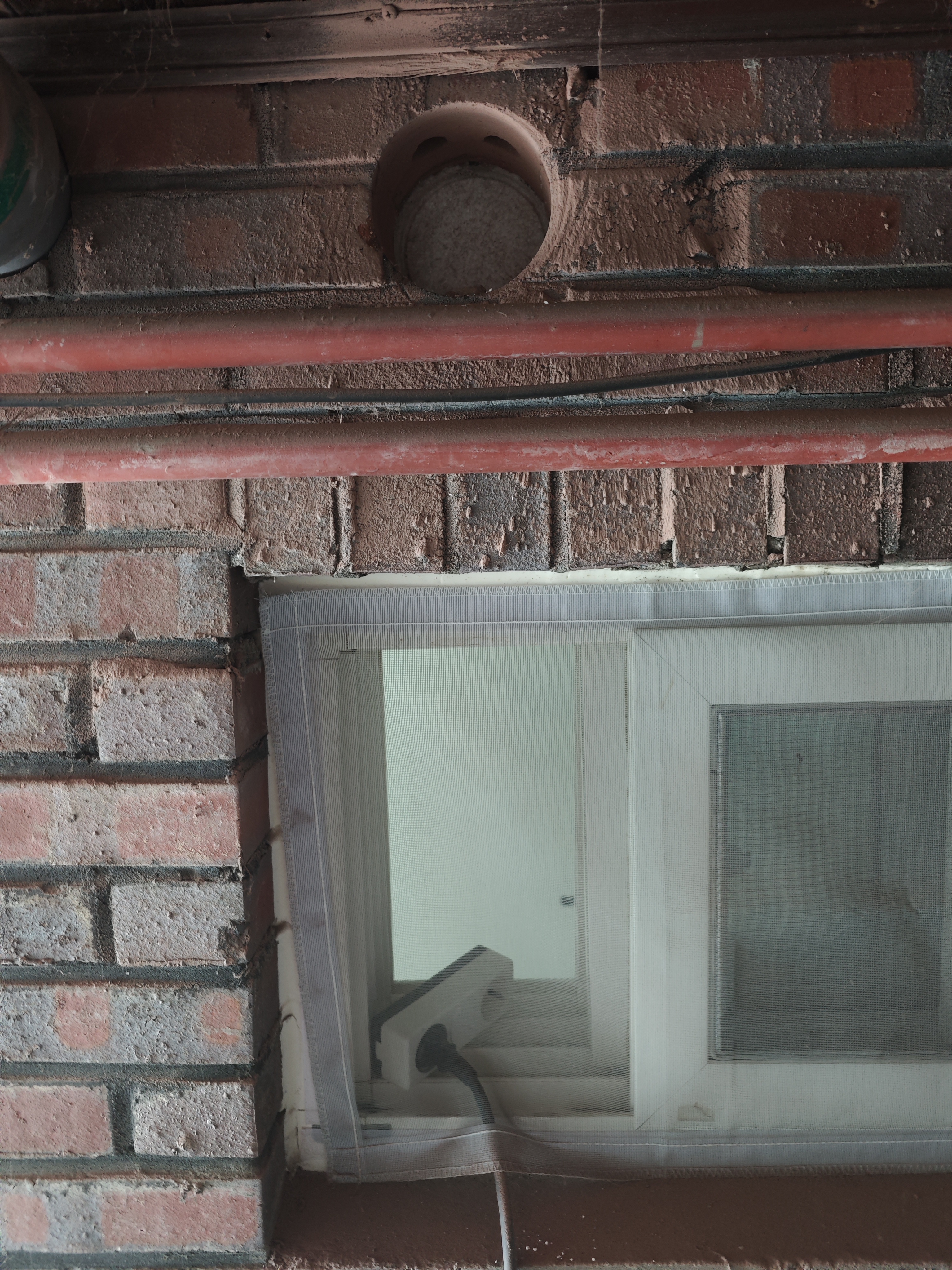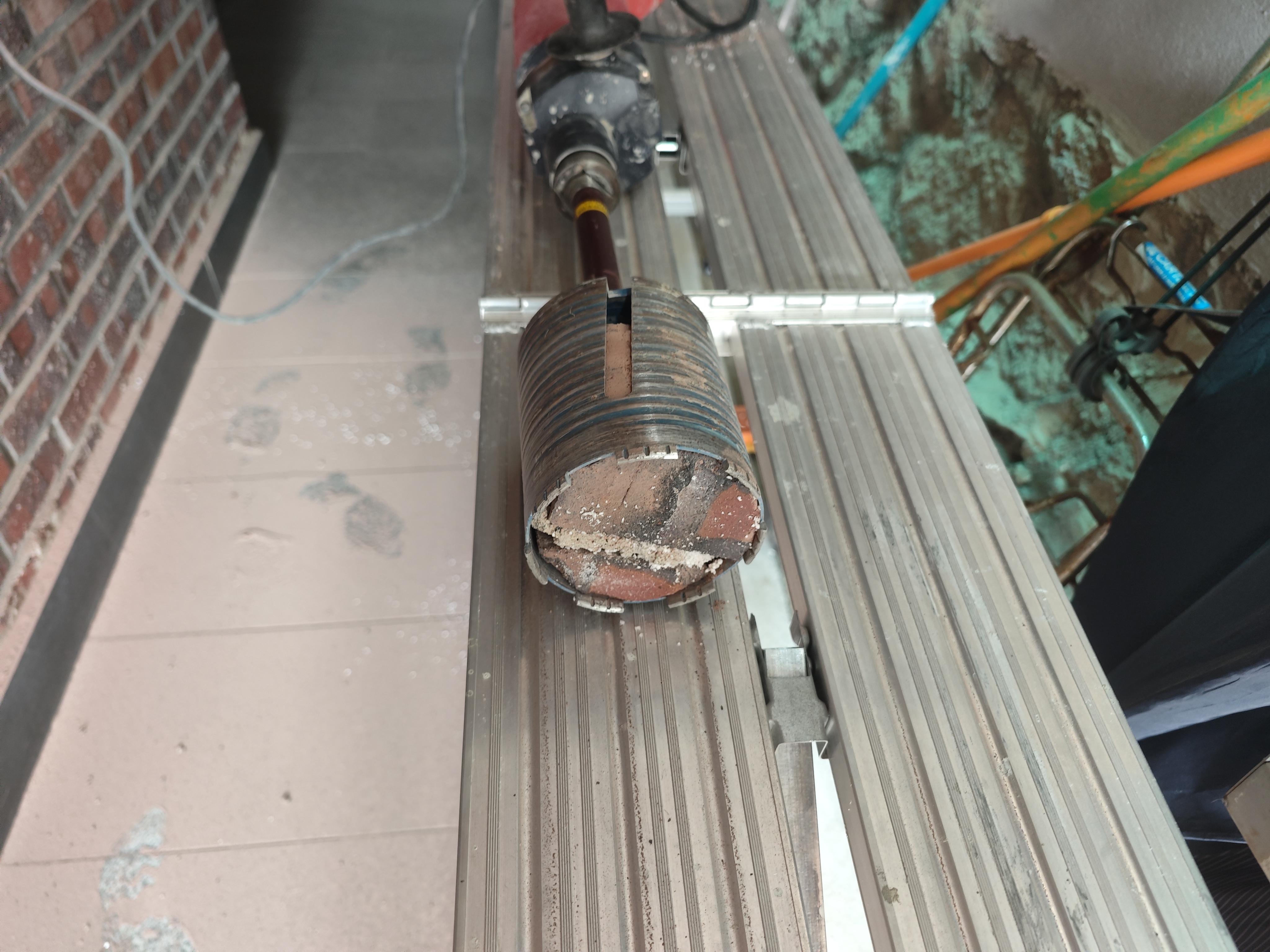 외벽에 적벽돌과 내벽에 시멘트벽돌을 뚫으니 완전히 구멍이 났다.