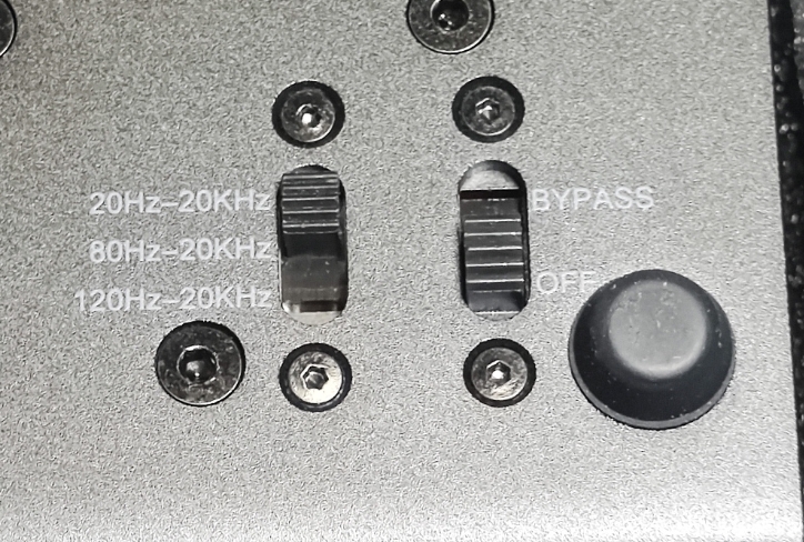 기기 하단에는 특징적인 스위치가 있는데 톤컨트롤 Bypass 버튼, 그리고 서브우퍼를 사용하기 위한 80Hz Cut, 120Hz Cut 스위치가 있다.
